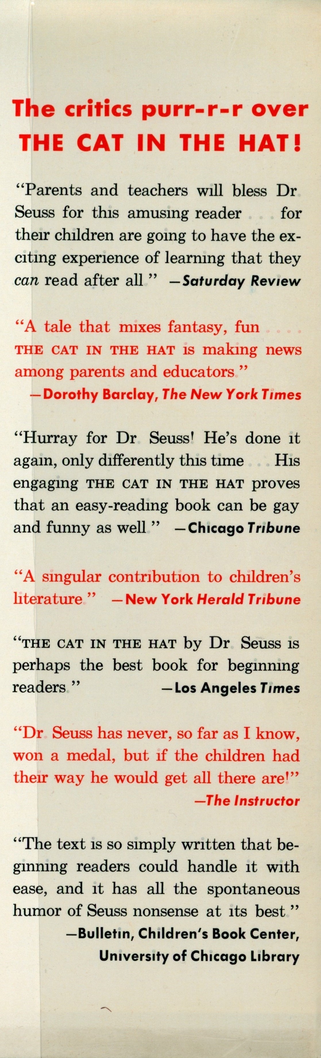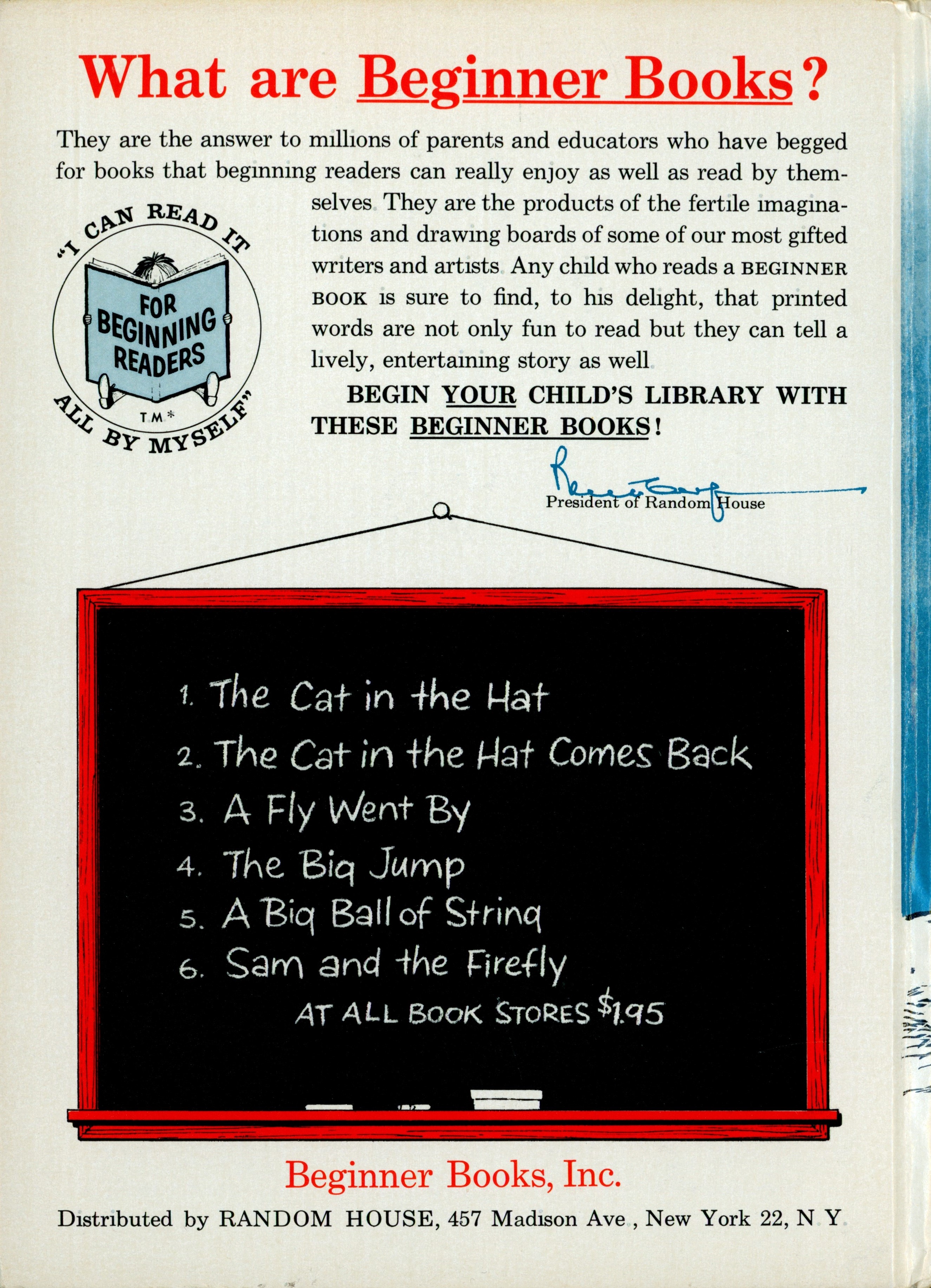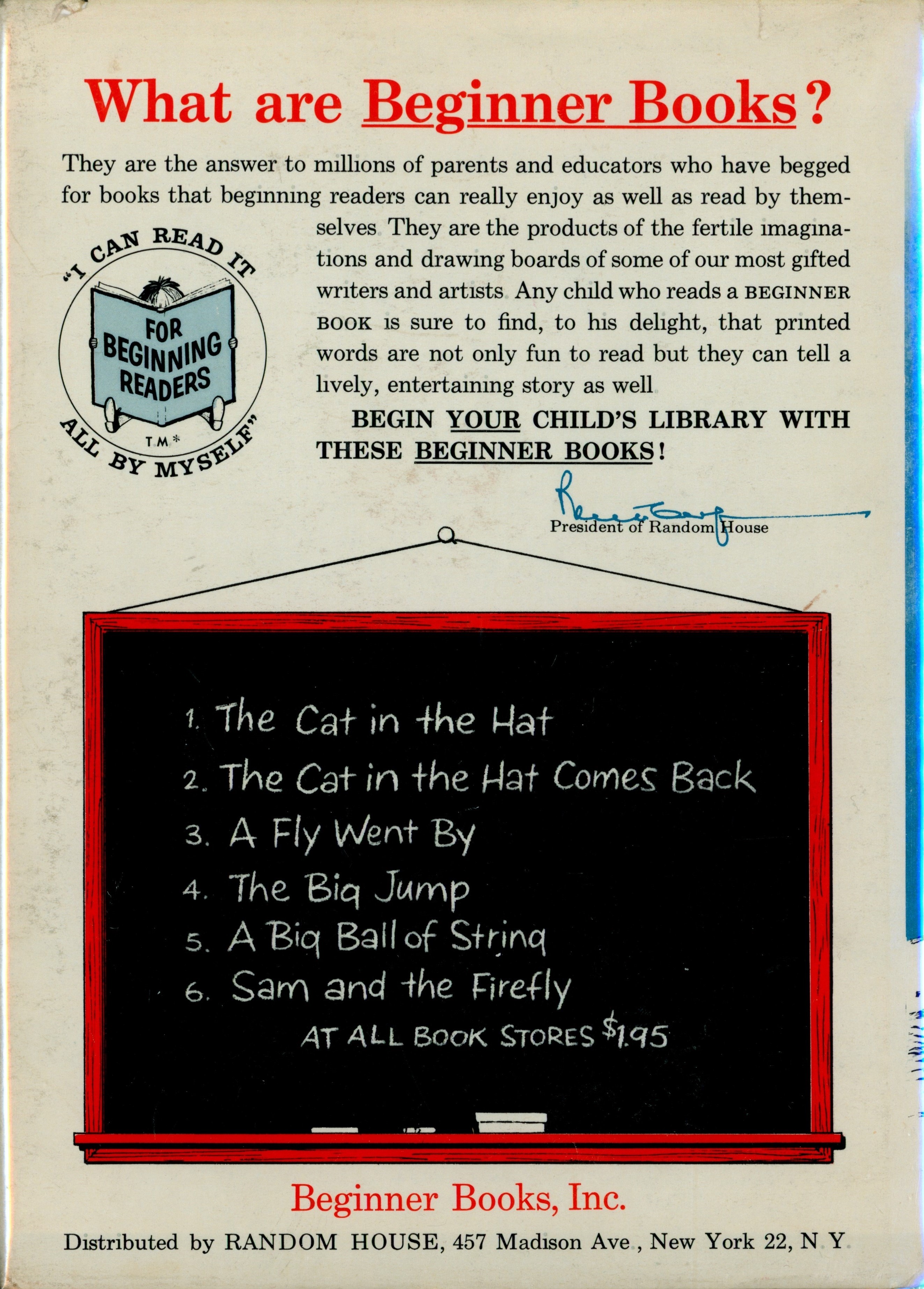 Book Back: Bound in illustrated paper covered boards. "What are Beginner Books? / They are the answer to millions of parents ... [...paragraph] / [FOR BEGINNING READERS Logo] / BEGIN YOUR CHILD'S LIBRARY WITH / THESE BEGINNER BOOKS! / [Bennett Cerf signature] / President of Random House / [Chalkboard graphic with six books listed as follows.] / 1. The Cat in the Hat / 2. The Cat in the Hat Comes Back / 3. A Fly Went By / 4. The Big Jump / A Big Ball of String / Sam and the Firefly / AT ALL BOOK STORES $1.95 / Beginner Books, Inc. / Distributed by RANDOM HOUSE, 437 Madison Ave. New York 22, N.Y."