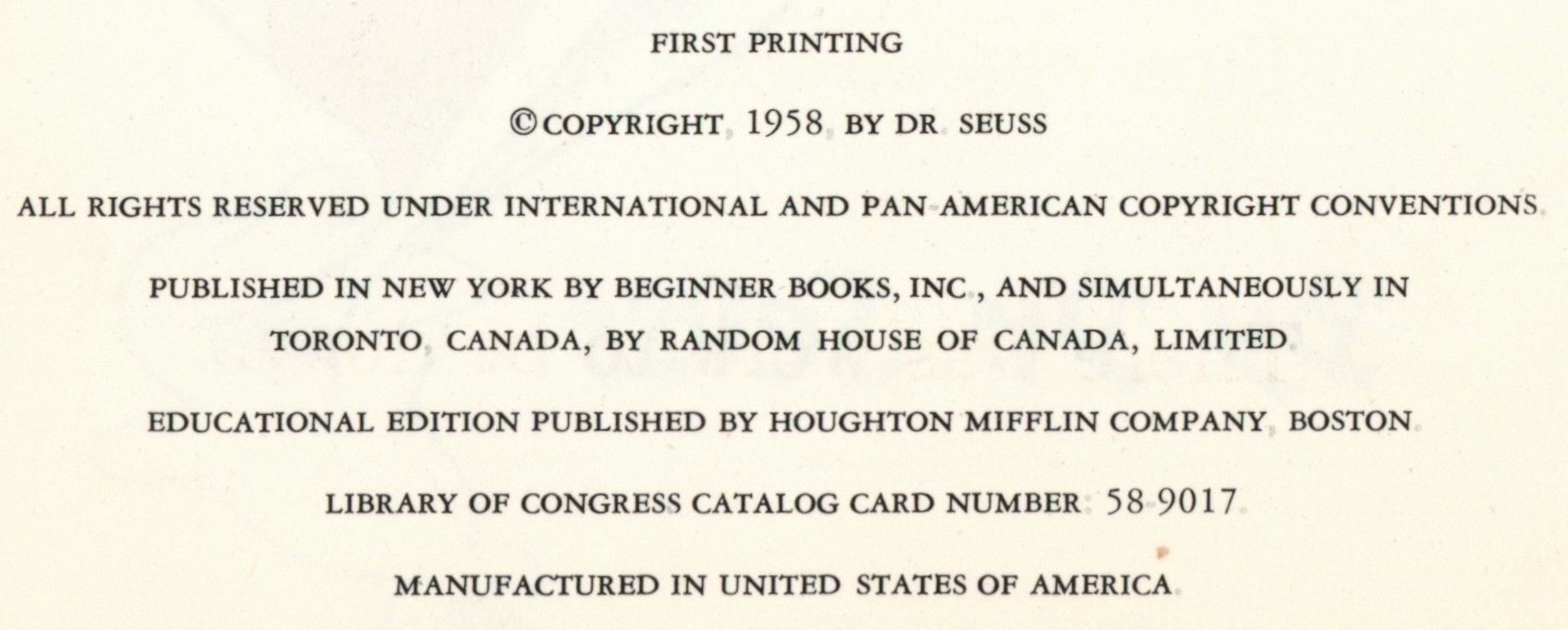 Copyright: "FIRST PRINTING / (c) COPYRIGHT 1958 by DR. SEUSS / ALL RIGHTS RESERVED UNDER INTERNATIONAL AND PAN-AMERICAN COPYRIGHT CONVENTIONS / PUBLISHED IN NEW YORK BY BEGINNER BOOKS, INC., AND SIMULTANEOUSLY IN / TORONTO, CANADA, BY RANDOM HOUSE OF CANADA, LIMITED. / EDUCATIONAL EDITION PUBLISHED BY HOUGHTON MIFFLIN COMPANY, BOSTON / LIBRARY OF CONGRESS CATALOG CARD NUMBER: 58-9017 / MANUFACTURED IN UNITED STATES OF AMERICA"