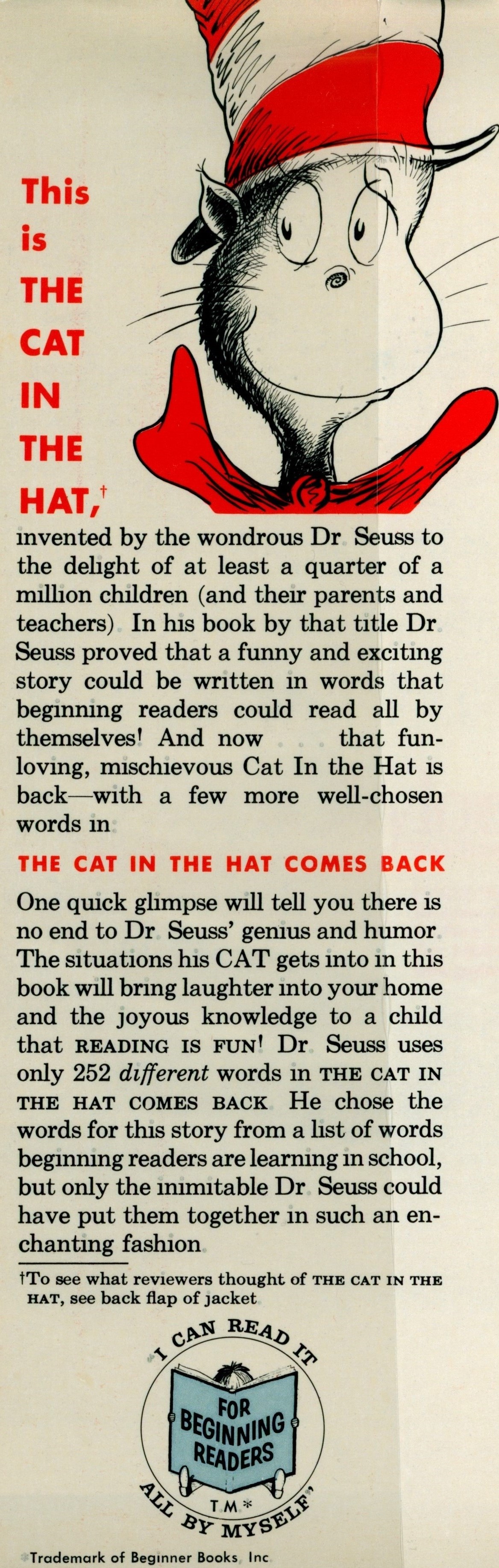 DJ Flap Front: "This / is / THE / CAT / IN / THE /HAT / [CITH image at top right] / invented by the wondrous Dr. Seuss to ... [... paragraph] / THE CAT IN THE HAT COMES BACK [red] / One quick glimpse will tell you there is ... [...paragraph] / *To see what reviewers thought of THE CAT IN THE / HAT, see back flap of jacket. / [Beginner Books Logo] / *Trademark of Beginner Books [very small at bottom of flap]"