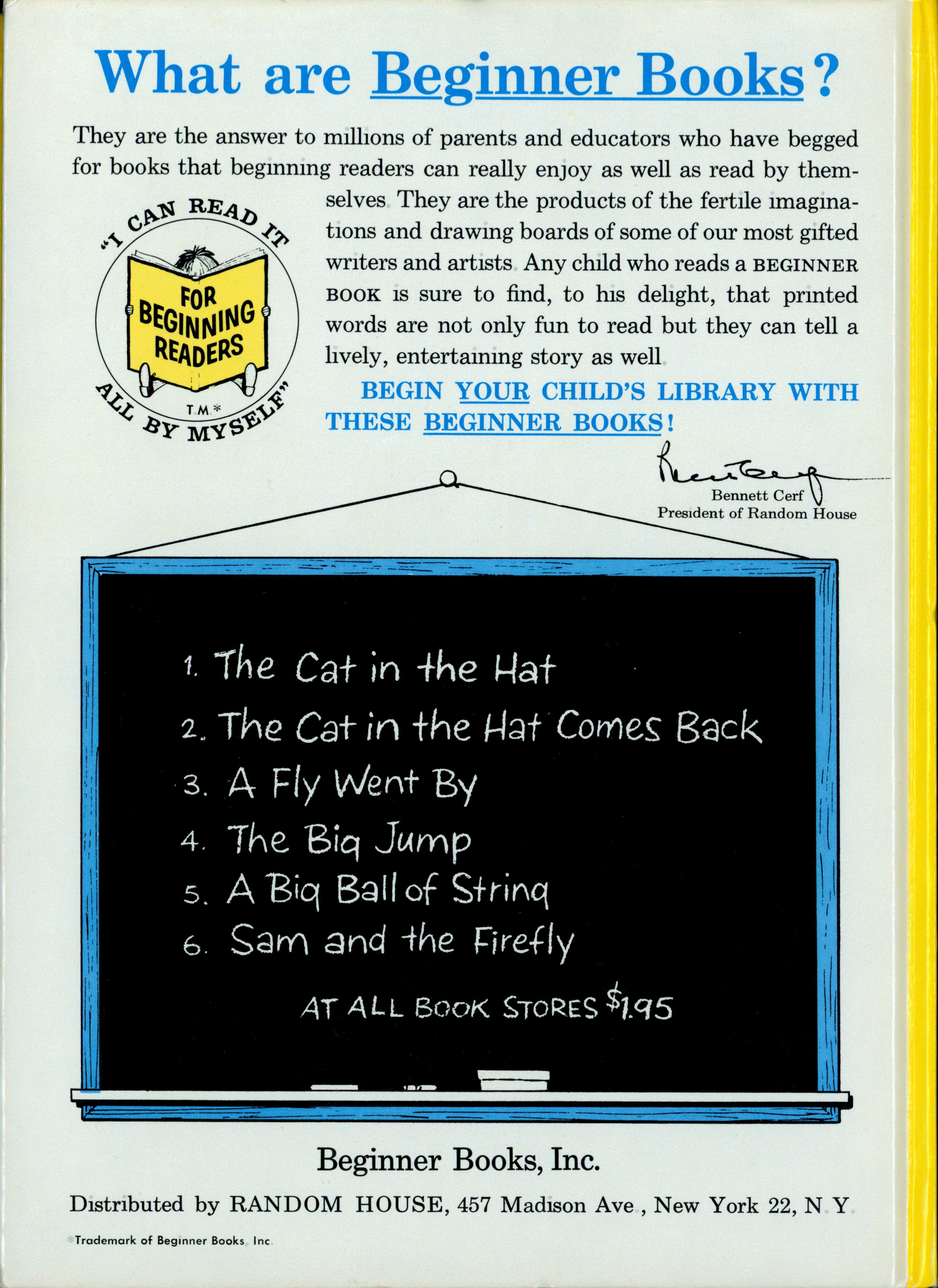 Book Back: Bound in illustrated paper covered boards. "What are Beginner Books? / They are the answer to millions of parents ... [...paragraph] / [FOR BEGINNING READERS Logo] / BEGIN YOUR CHILD'S LIBRARY WITH / THESE BEGINNER BOOKS! / [Bennett Cerf signature] / President of Random House / [Chalkboard graphic with six books listed as follows.] / 1. The Cat in the Hat / 2. The Cat in the Hat Comes Back / 3. A Fly Went By / 4. The Big Jump / A Big Ball of String / Sam and the Firefly / AT ALL BOOK STORES $1.95 / Beginner Books, Inc. / Distributed by RANDOM HOUSE, 437 Madison Ave. New York 22, N.Y. / Trademark of Beginner Books, Inc. [very small text at bottom left]"