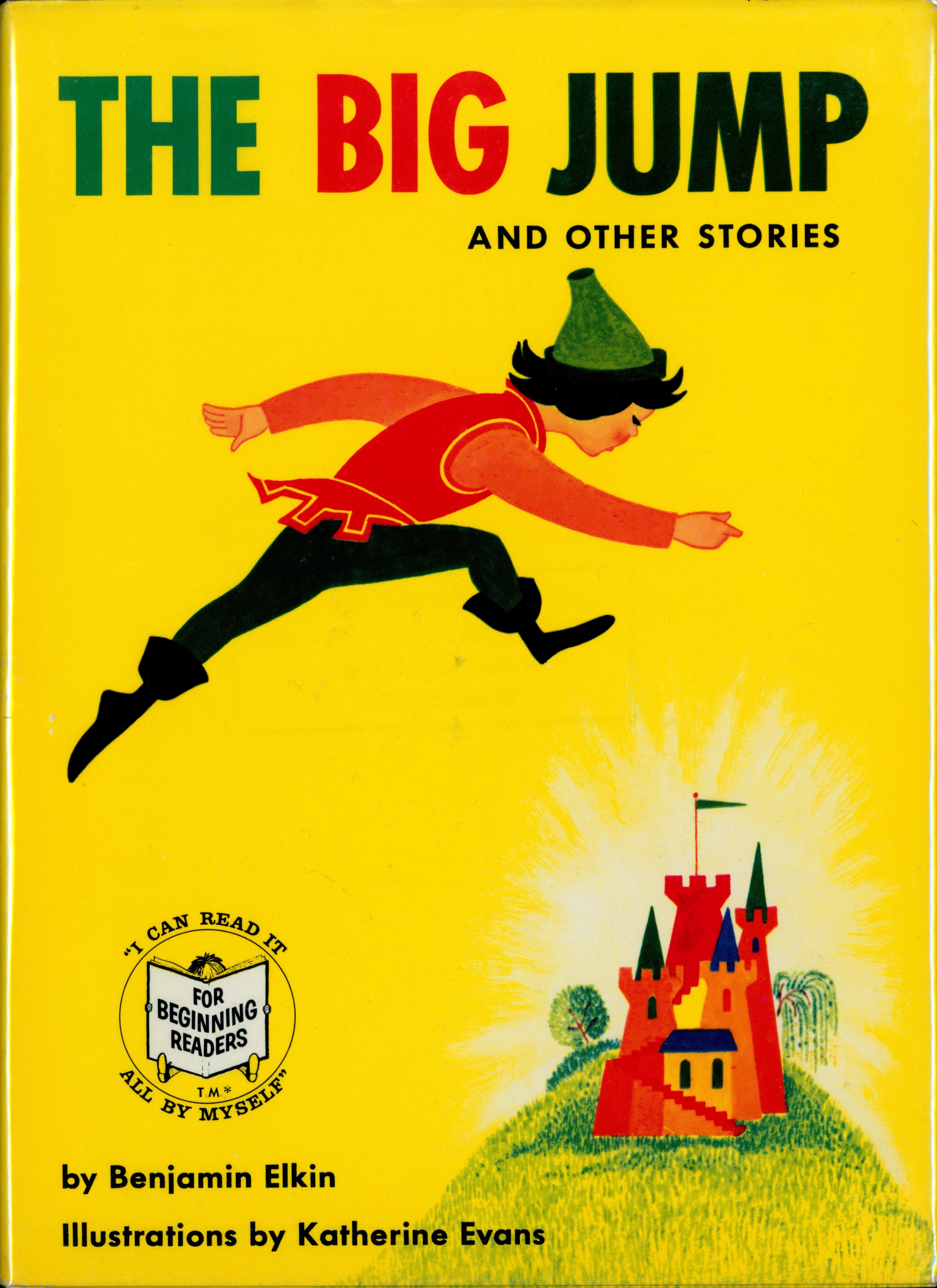 Book Front: Bound in glossy yellow paper covered boards with color illustration. "THE BIG JUMP / AND OTHER STORIES / [color illustration] / [FOR BEGINNING READERS Logo] / By Benjamin Elkin / Illustrated by Katherine Evans"