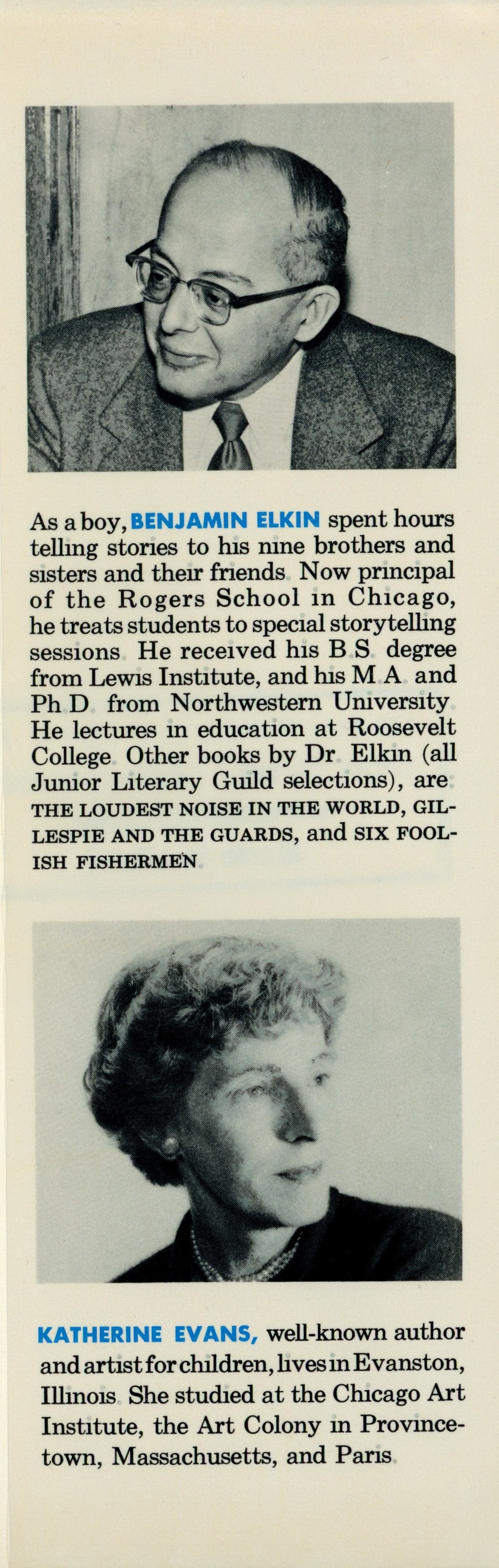 DJ Flap Back: "[Benjamin Elkin photograph] / [Benjamin Elkin biography] / [Katherine Evans photograph] / [Katherine Evans biography]"