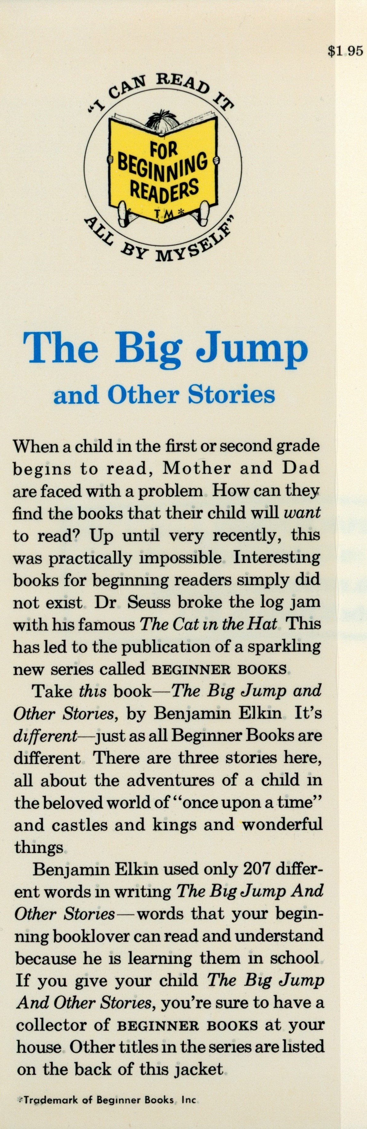 DJ Flap Front: "$1.95 [top right] / [Beginner Books Logo] / The Big Jump / and Other Stories / When a child in the first of second grade ... [... paragraph] / Take this book -- The Big Jump and ... [...paragraph] / Benjamin Elkin used only 207 differ- ... [... paragraph] / *Trademark of Beginner Books, Inc. [very small black text bottom of flap]"
