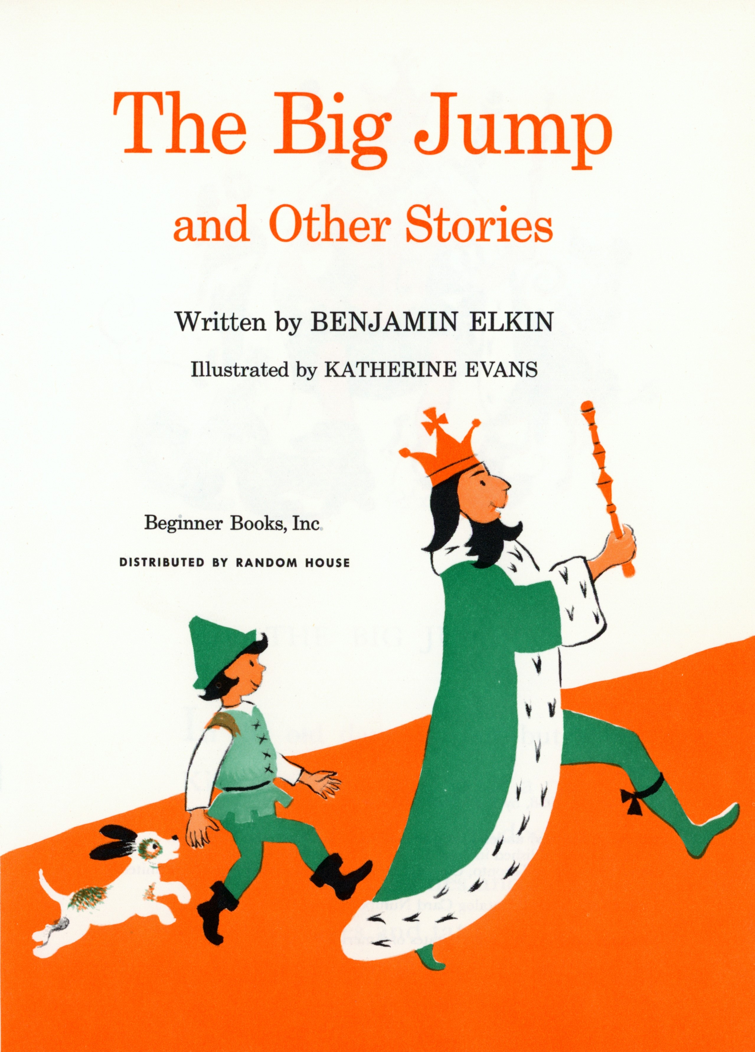 Title Page: "The Big Jump / and Other Stories / Written By Benjamin Elkin / Illustrated by Katherine Evans / Beginner Books, Inc. / DISTRIBUTED BY RANDOM HOUSE / [color illustration]"