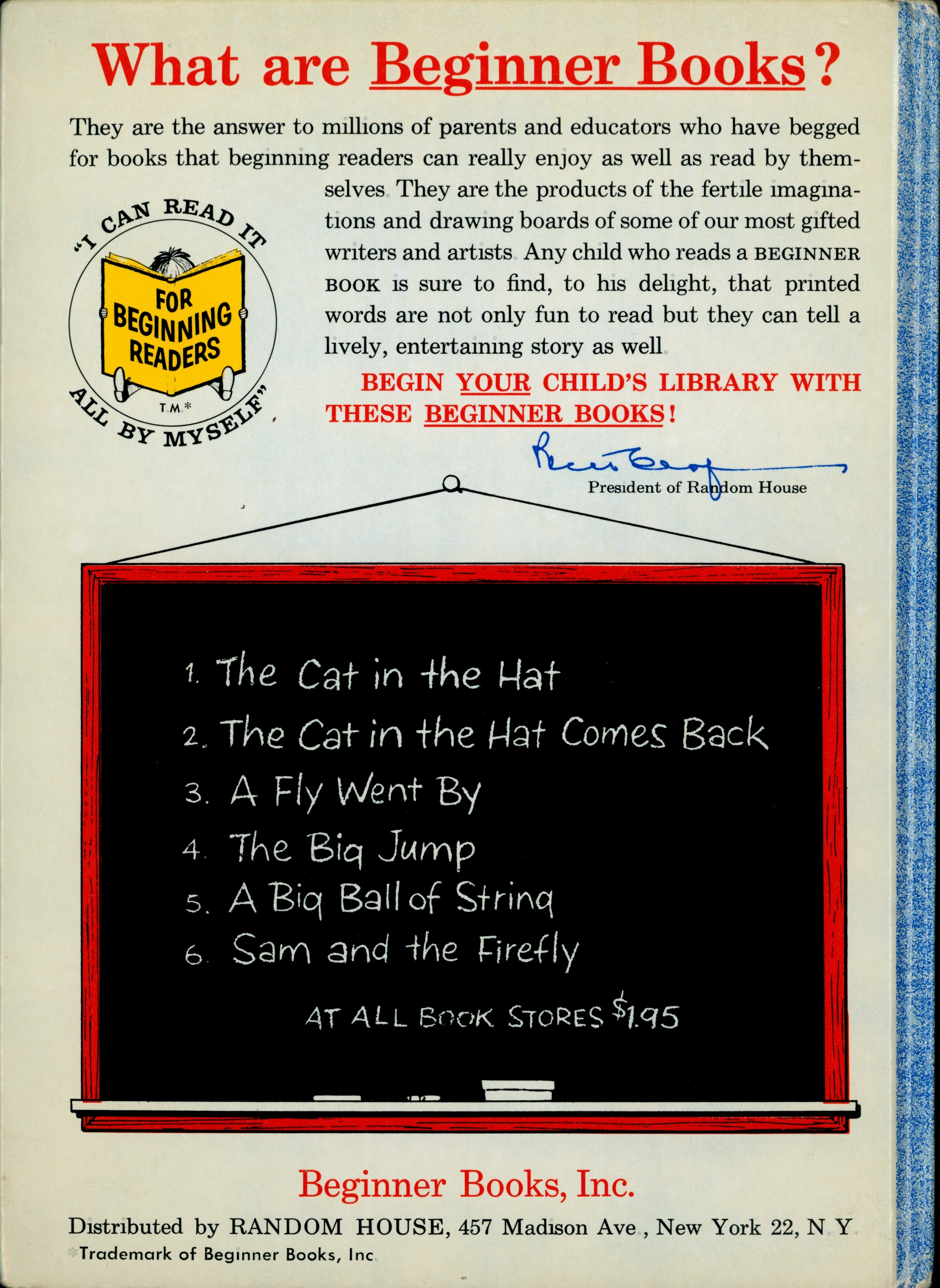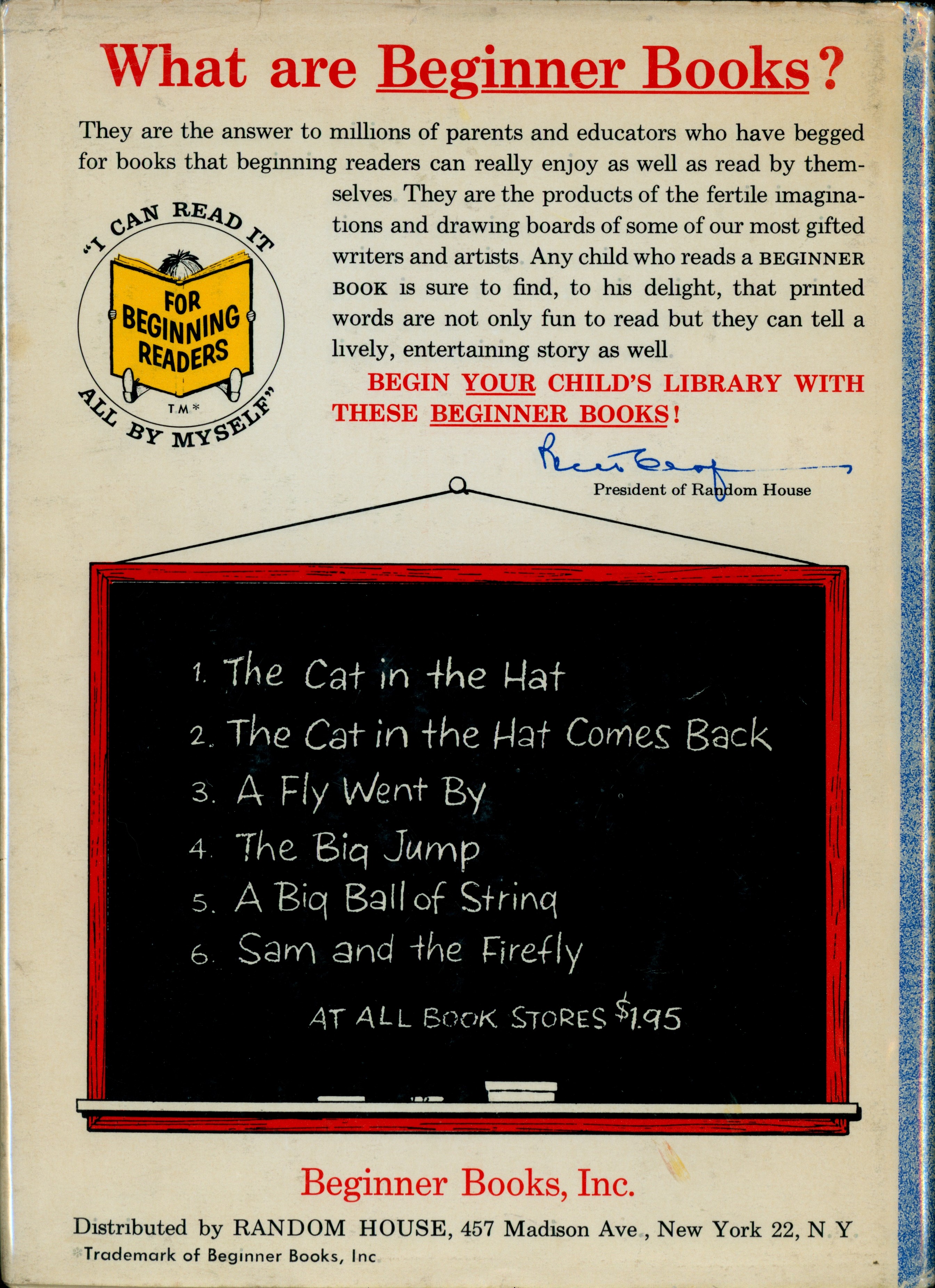 Book Back: Bound in illustrated paper covered boards. "What are Beginner Books? / They are the answer to millions of parents ... [...paragraph] / [FOR BEGINNING READERS Logo] / BEGIN YOUR CHILD'S LIBRARY WITH / THESE BEGINNER BOOKS! / [Bennett Cerf signature] / President of Random House / [Chalkboard graphic with six books listed as follows.] / 1. The Cat in the Hat / 2. The Cat in the Hat Comes Back / 3. A Fly Went By / 4. The Big Jump / A Big Ball of String / Sam and the Firefly / AT ALL BOOK STORES $1.95 / Beginner Books, Inc. / Distributed by RANDOM HOUSE, 437 Madison Ave. New York 22, N.Y. / Trademark of Beginner Books, Inc. [very small text at bottom left]"