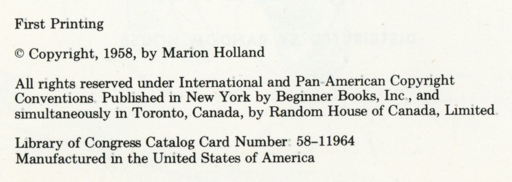 Copyright: "To/ NICK and ANDREW [top middle of page] / First Printing / (c) Copyright, 1958, by Marion Holland / All rights reserved under International and Pan-American Copyright / Conventions. Published in New York by Beginner Books, Inc., and / simultaneously in Toronto, Canada, by Random House of Canada, Limited. / Library of Congress Catalog Card Number: 58-11964. Manufactured in the United States of America."