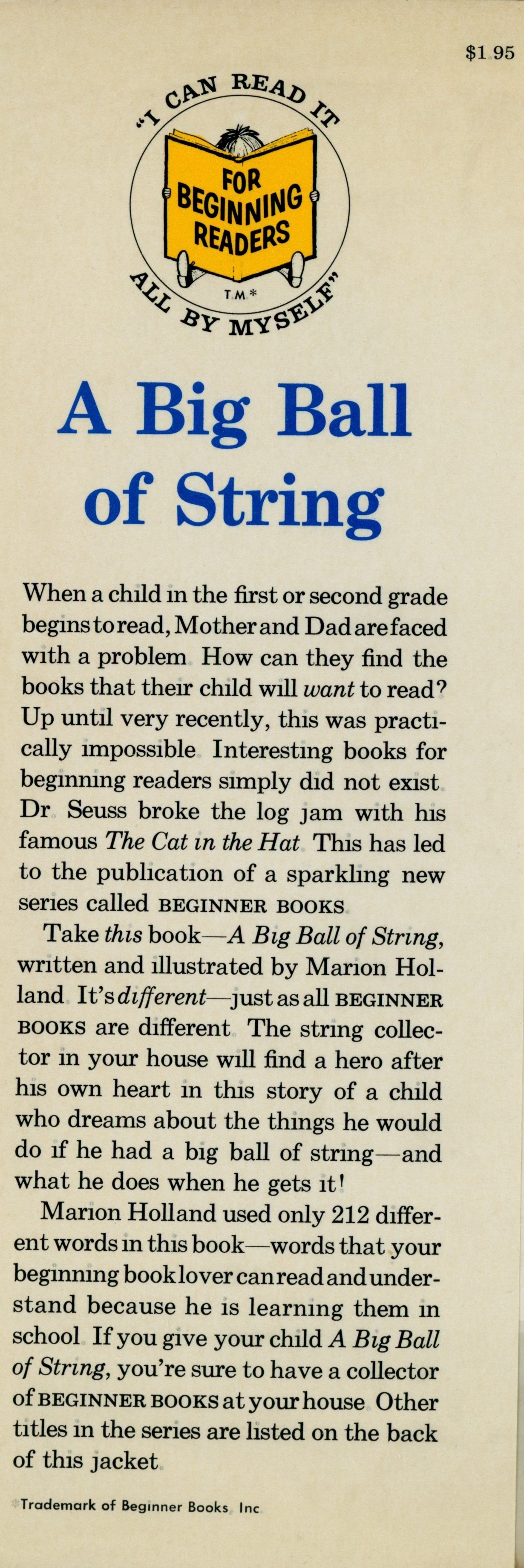DJ Flap Front: "$1.95 [top right] / [Beginner Books Logo] / A Big Ball / of String / When a child in the first of second grade ... [... paragraph] / Take this book -- A Big Ball of String ... [...paragraph] / Marion Holland used only 212 differ- ... [... paragraph] / *Trademark of Beginner Books, Inc. [very small black text bottom of flap]"