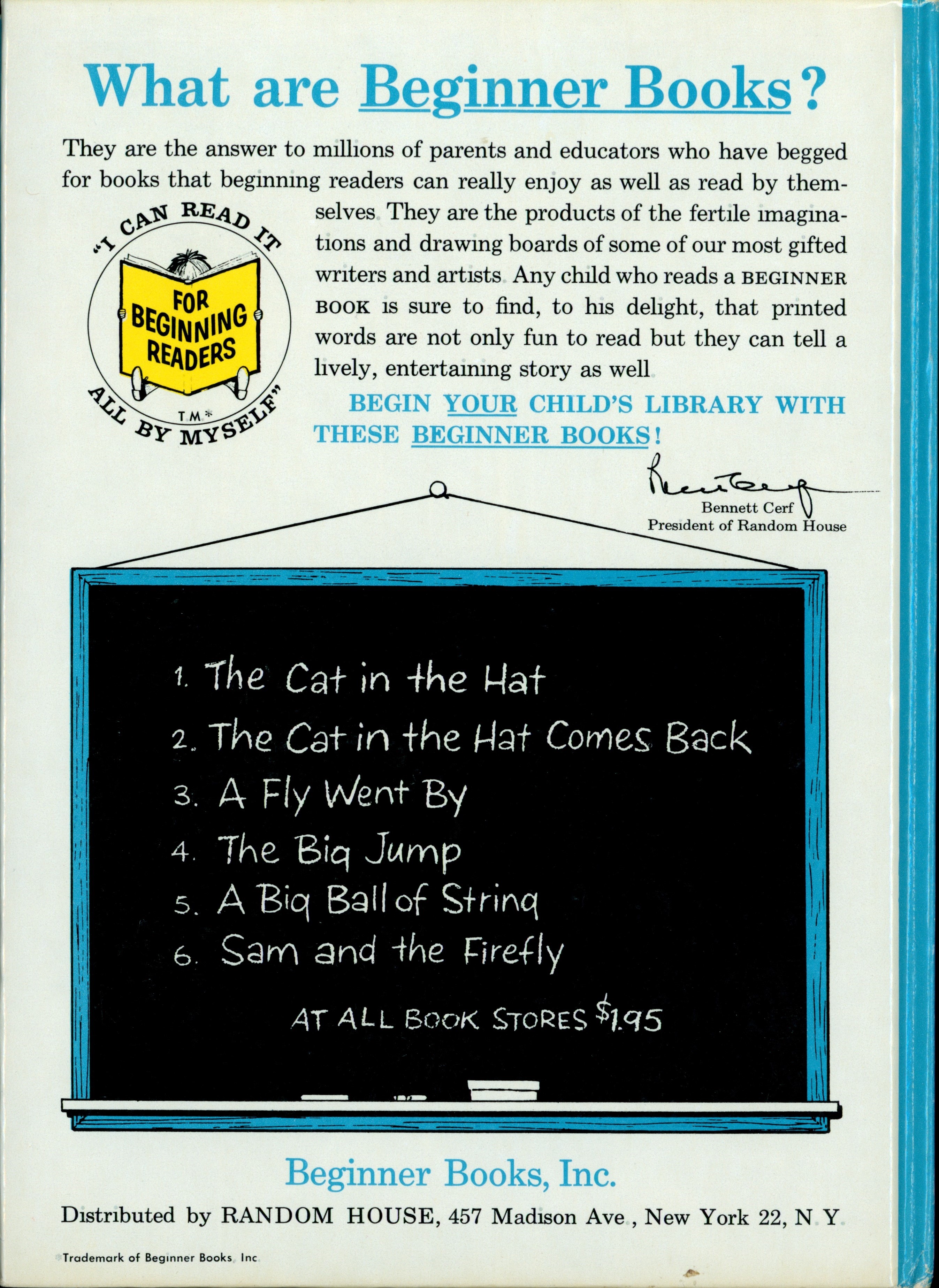 Book Back: Bound in illustrated paper covered boards. "What are Beginner Books? / They are the answer to millions of parents ... [...paragraph] / [FOR BEGINNING READERS Logo] / BEGIN YOUR CHILD'S LIBRARY WITH / THESE BEGINNER BOOKS! / [Bennett Cerf signature] / President of Random House / [Chalkboard graphic with six books listed as follows.] / 1. The Cat in the Hat / 2. The Cat in the Hat Comes Back / 3. A Fly Went By / 4. The Big Jump / A Big Ball of String / Sam and the Firefly / AT ALL BOOK STORES $1.95 / Beginner Books, Inc. / Distributed by RANDOM HOUSE, 437 Madison Ave. New York 22, N.Y. / Trademark of Beginner Books, Inc. [very small text at bottom left]"