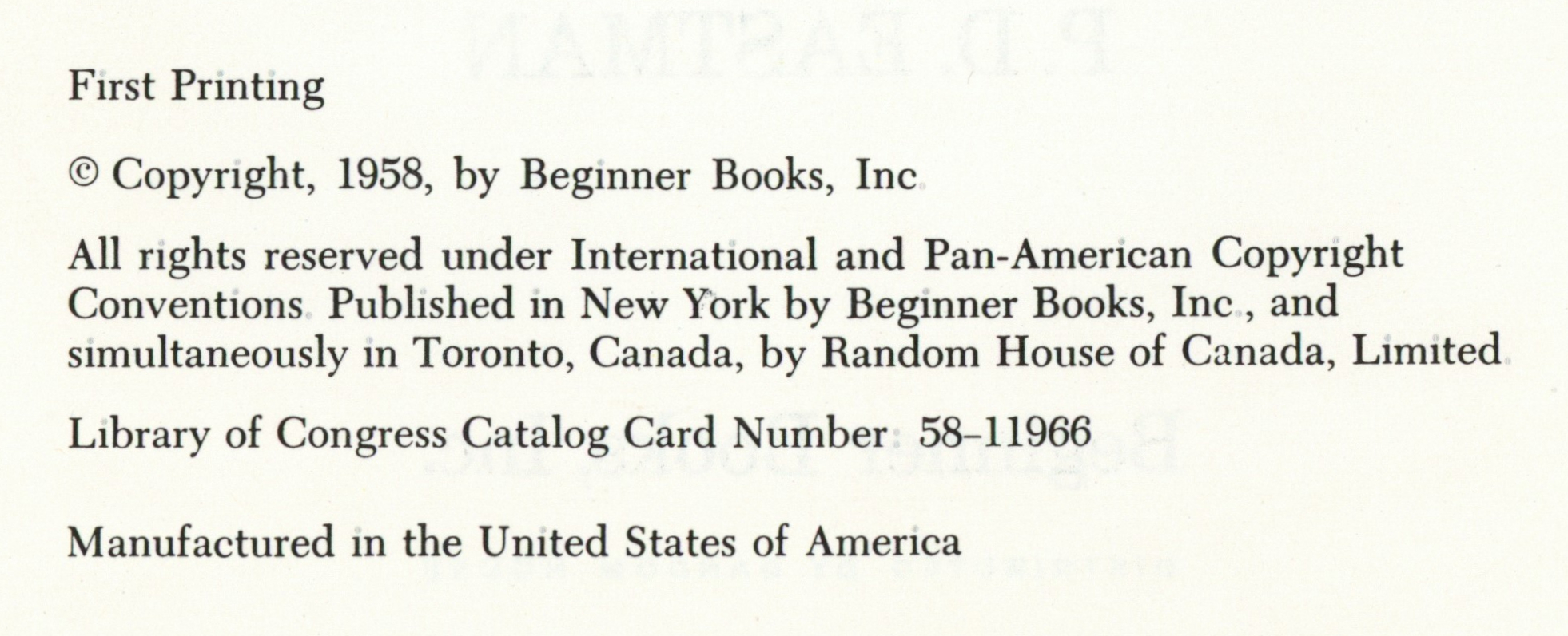 Copyright: "First Printing / (c) Copyright, 1958, by Beginner Books, Inc / All rights reserved under International and Pan-American Copyright / Conventions. Published in New York by Beginner Books, Inc., and / simultaneously in Toronto, Canada, by Random House of Canada, Limited. / Library of Congress Catalog Card Number: 58-11966. Manufactured in the United States of America."