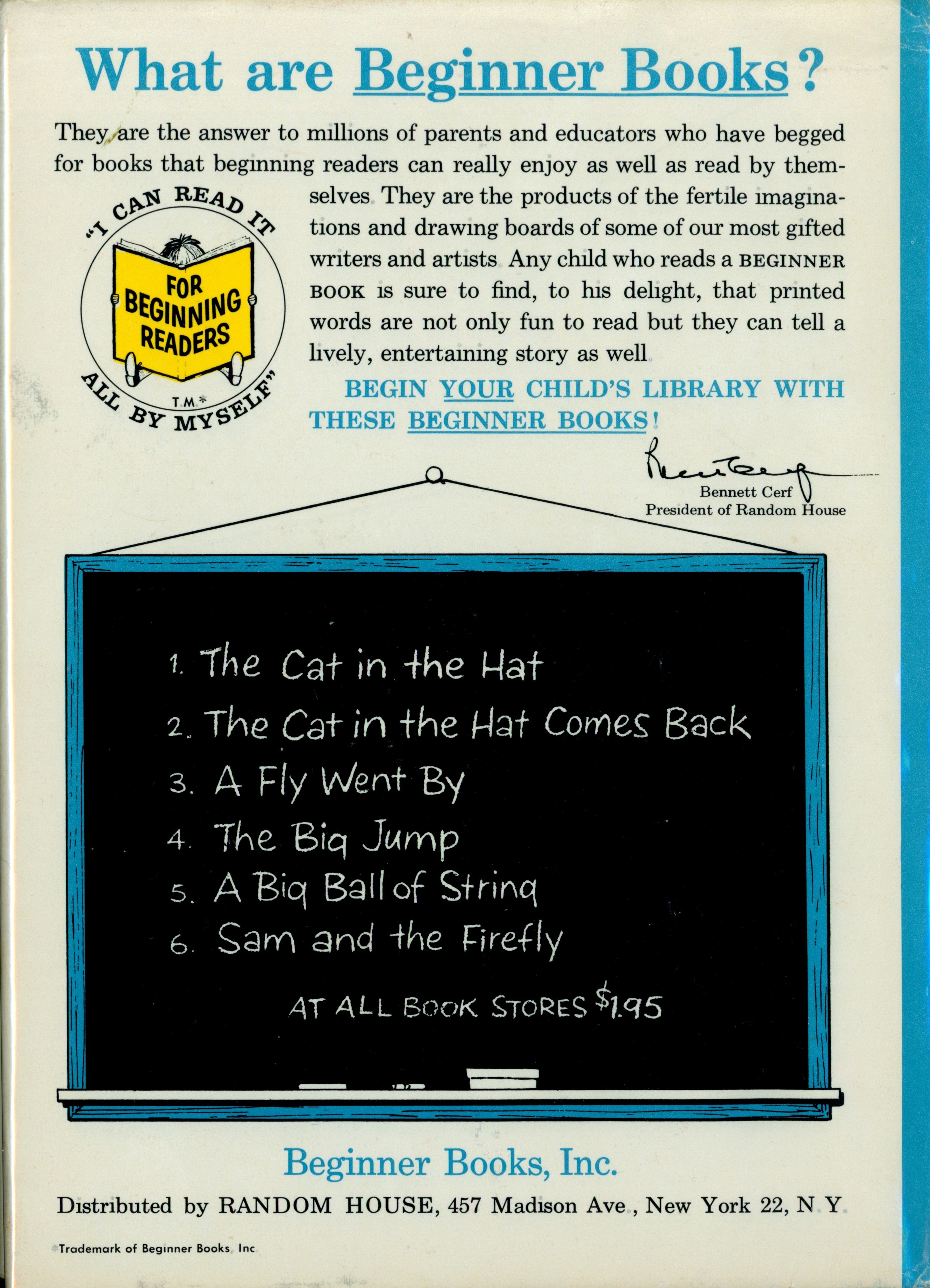 "What are Beginner Books? / They are the answer to millions of parents and educators who have begged ... [...paragraph] / [FOR BEGINNING READERS' logo] / BEGIN YOUR CHILD'S LIBRARY WITH THESE BEGINNER BOOKS / [Bennett Cerf Signature] / Bennett Cerf / President of Random House / [Chalkboard with numbered list of first 6 Beginner Books] / AT ALL BOOK STORES $1.94 / Beginner Books, Inc. / Distributed by RANDOM HOUSE, 457 Madison Ave., New York 22, N. Y." [Note: lacks 'Trademark of Beginner Books, Inc.' bottom left.]