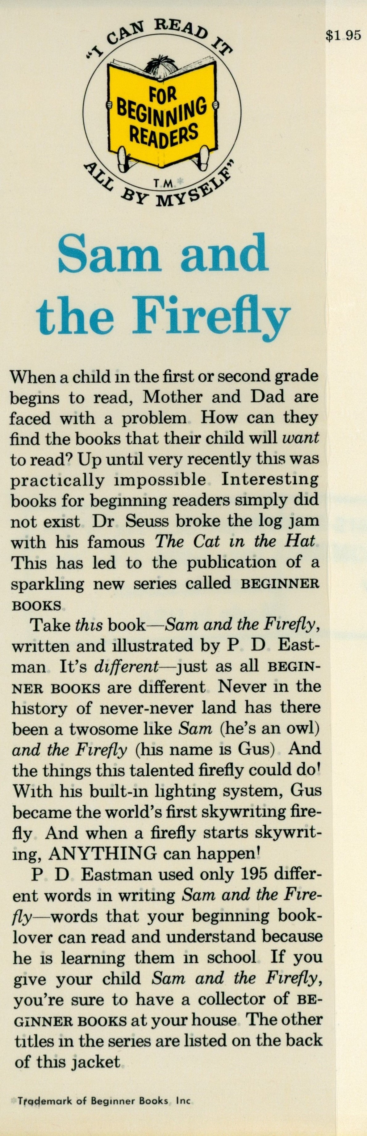 DJ Flap Front: "$1.95 [top right] / [Beginner Books Logo] / Sam and / the Firefly / When a child in the first of second grade ... [... paragraph] / Take this book -- Sam and the Firefly ... [...paragraph] / P.D. Eastman used only 195 differ- ... [... paragraph] / *Trademark of Beginner Books, Inc. [very small black text bottom of flap]"