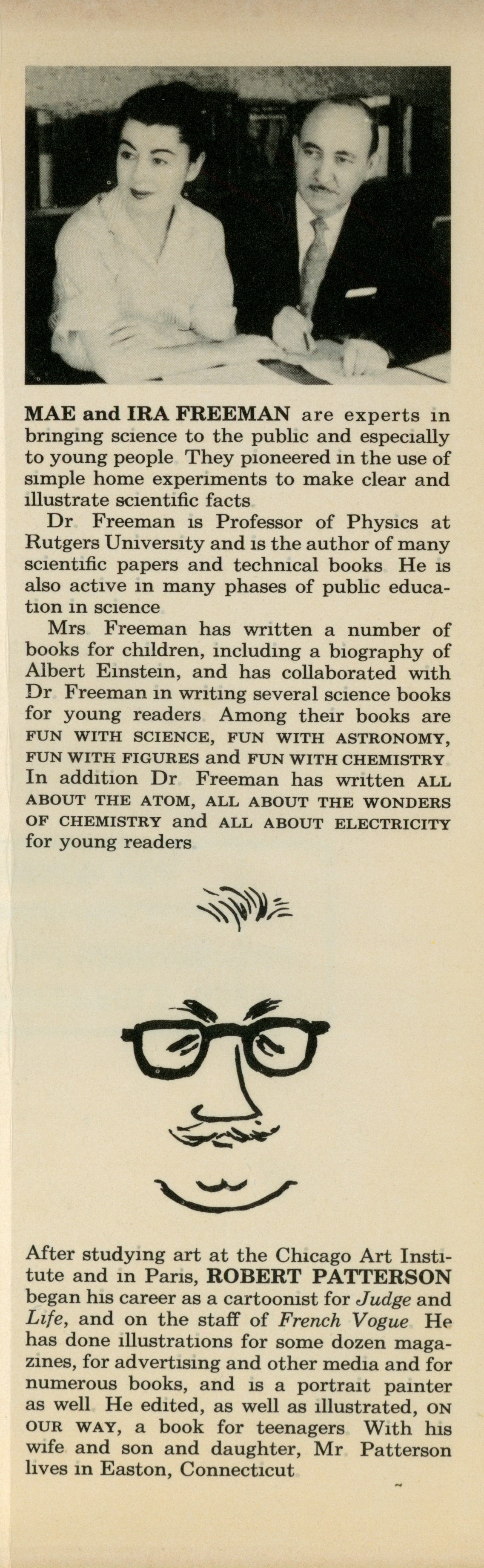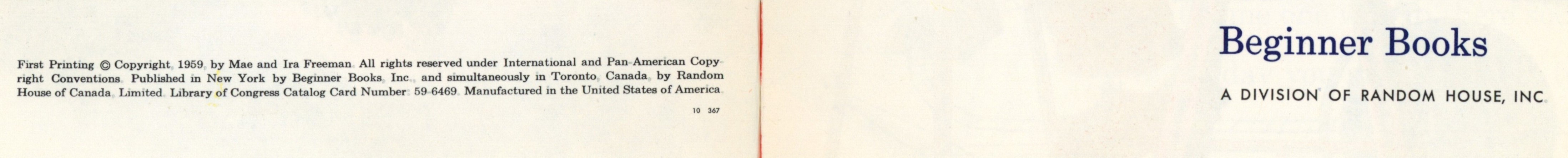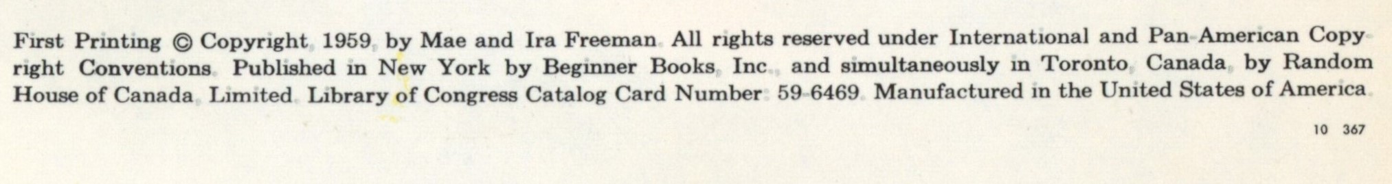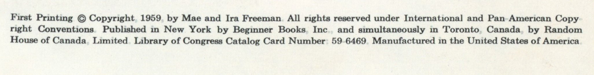 Copyright: "First Printing (c) Copyright 1959 by Mae & Ira Freeman. All rights reserved under International and Pan-American Copy- / right Conventions. Published in New York by Beginner Books, Inc. and simultaneously in Toronto, Canada by Random / House of Canada Limited. Library of Congress Catalog Card Number 59-6459. Manufactured in the United States of America."