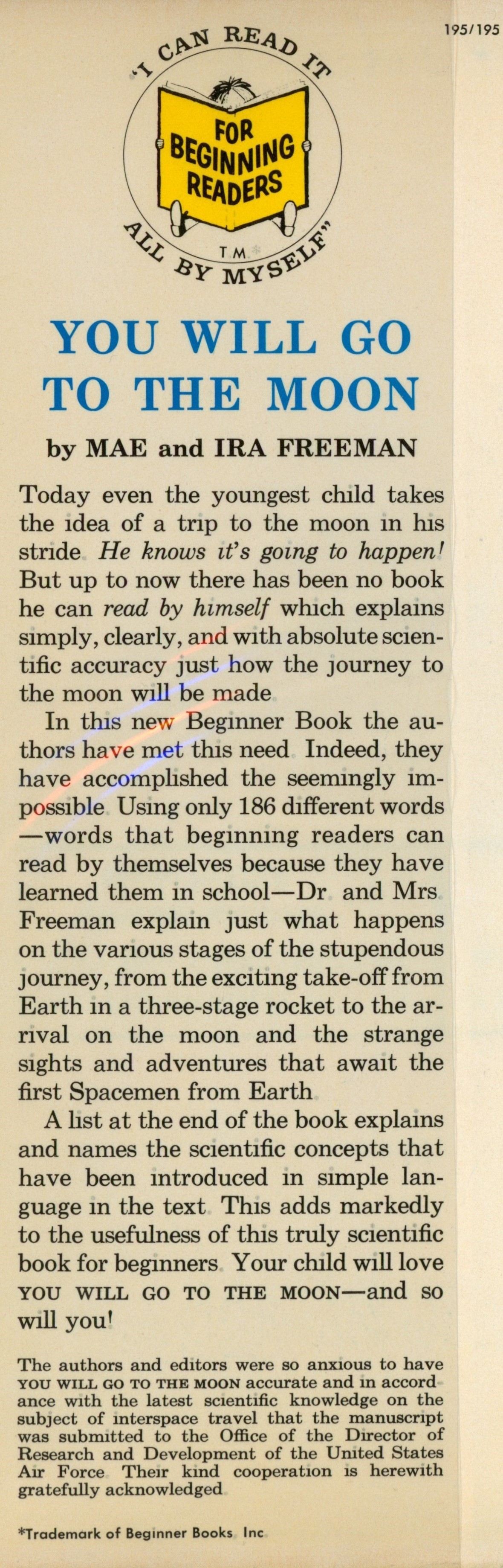 Book Spine: "YOU WILL GO TO THE MOON BY MAE AND IRE FREEMAN BEGINNER BOOKS, INC." [all white text]