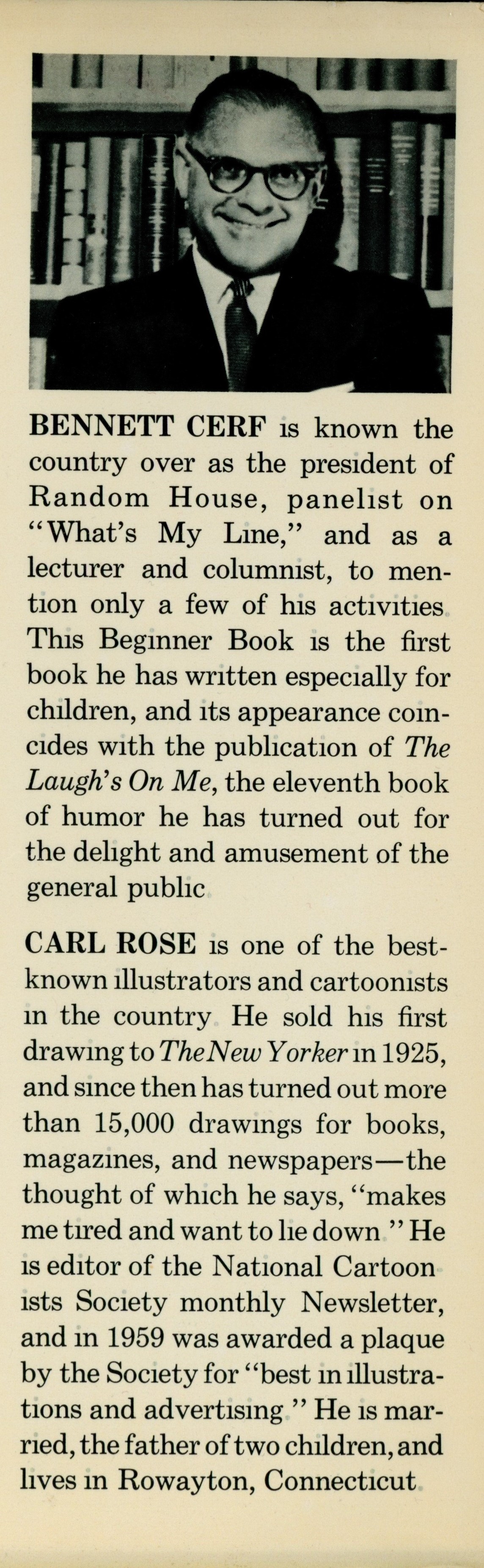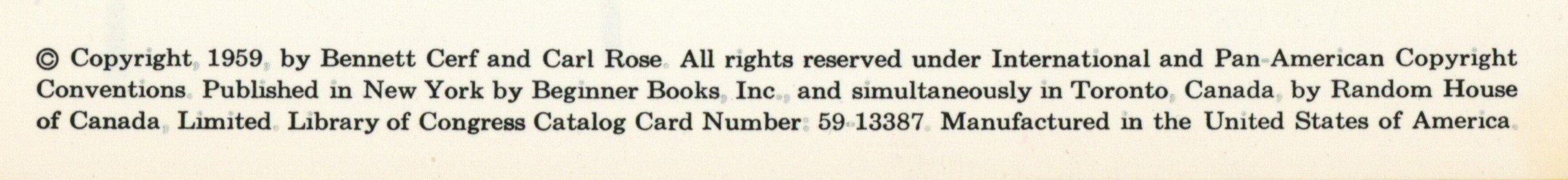 Copyright: "(c) Copyright 1959 by Bennett Cerf and Carl Rose. All rights reserved under International and Pan-American Copyright / Conventions. Published in New York by Beginner Books, Inc., and simultaneously in Toronto, Canada, by Random House / of Canada, Limited. Library of Congress Catalog Card Number: 59-13387. Manufactured in the United States of America."
