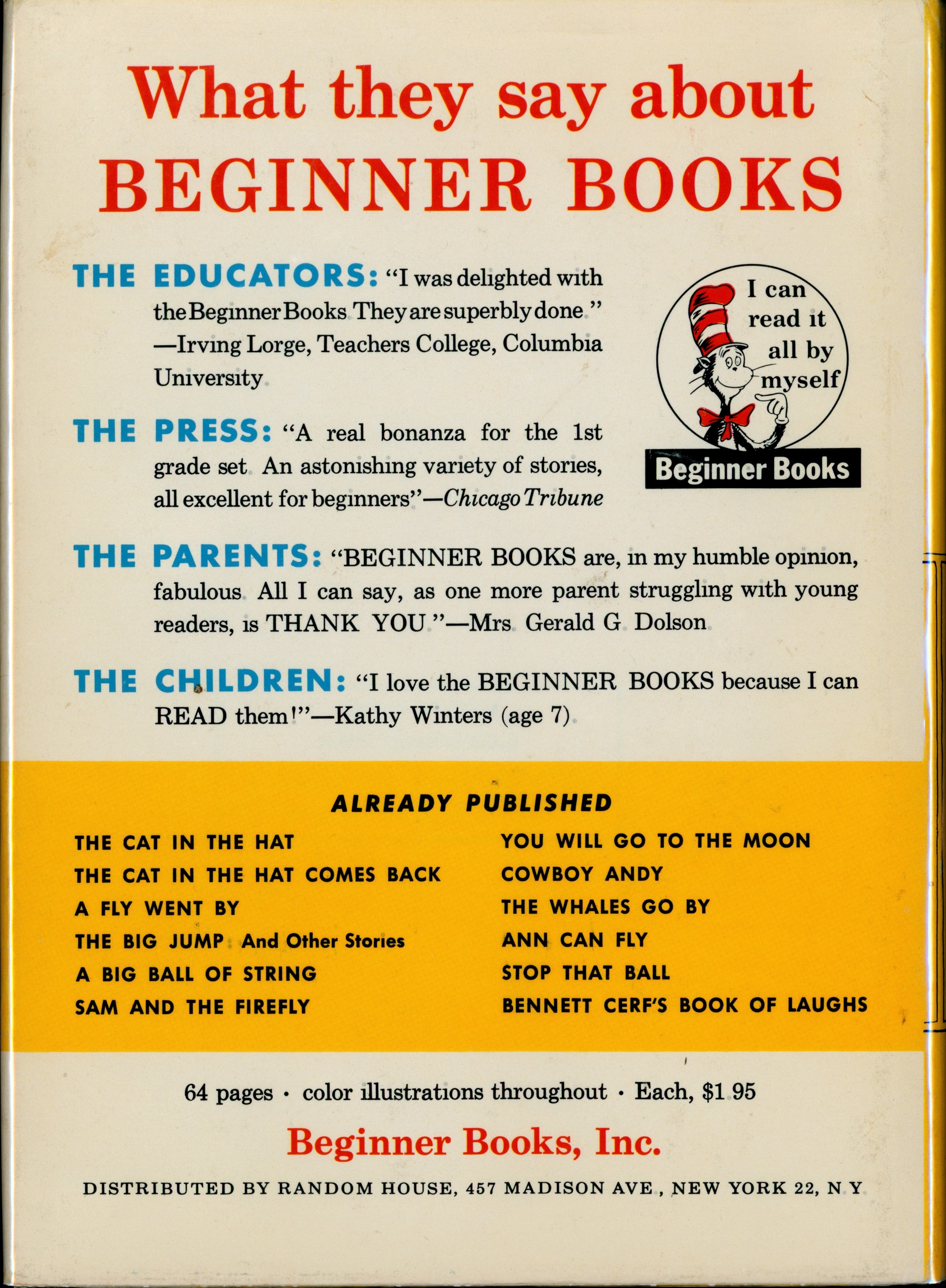 "What they say about / BEGINNER BOOKS / THE EDUCATORS: / "I was delighted with the Beginner Books ... [... paragraph] / [Beginner Book logo] / THE PRESS: / "A real bonanza for the 1st ... [... paragraph] / THE PARENTS: / "BEGINNER BOOKS are in my humble opinion, ... [... paragraph] / / THE CHILDREN: "I love the BEGINNER BOOKS because I / can READ them!" -- Kathy Winters (age 7) / ALREADY PUBLISHED / [First 12 BB titles listed in two columns of six] / 64 pages • color illustrations throughout • Each, $1.95 / Beginner Books, Inc. / DISTRIBUTED BY RANDOM HOUSE, 457 MADISON AVE. NEW YORK, 22 N.Y."