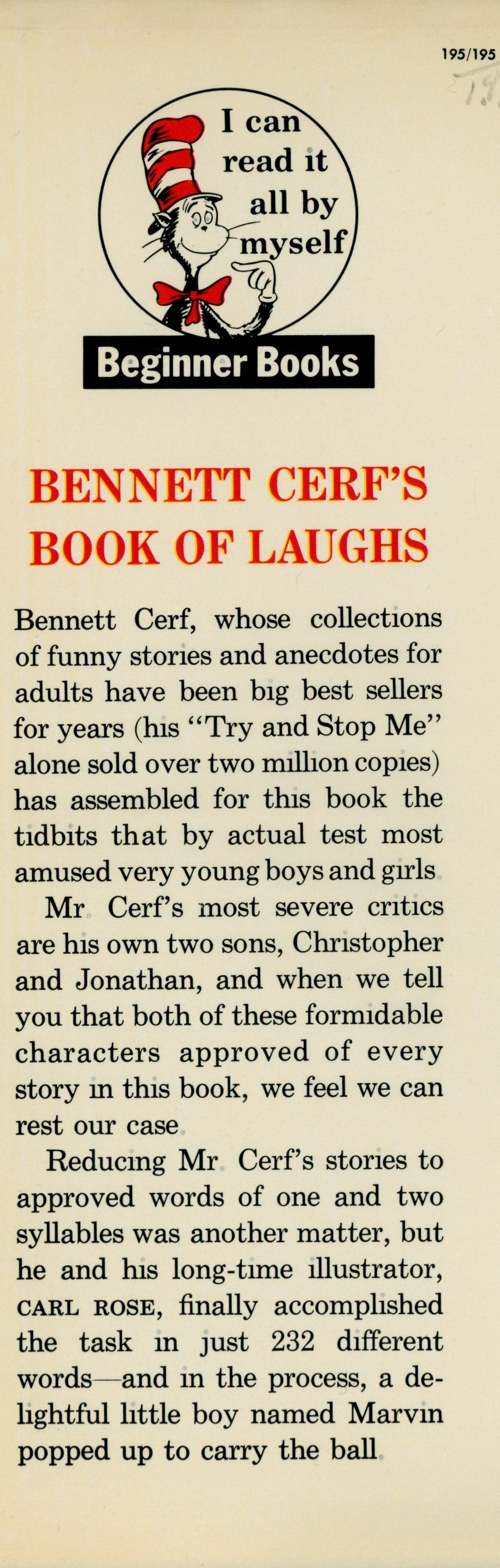 DJ Flap Front: "195/195 [top right] / [Beginner Books Logo] / BENNETT CERF'S / BOOK OF LAUGHS / Bennett Cerf, whose collections ... [... paragraph] / Mr. Cerf's most severe critics ... [...paragraph] / Reducing Mr. Cerf's stories to ... [... paragraph]"