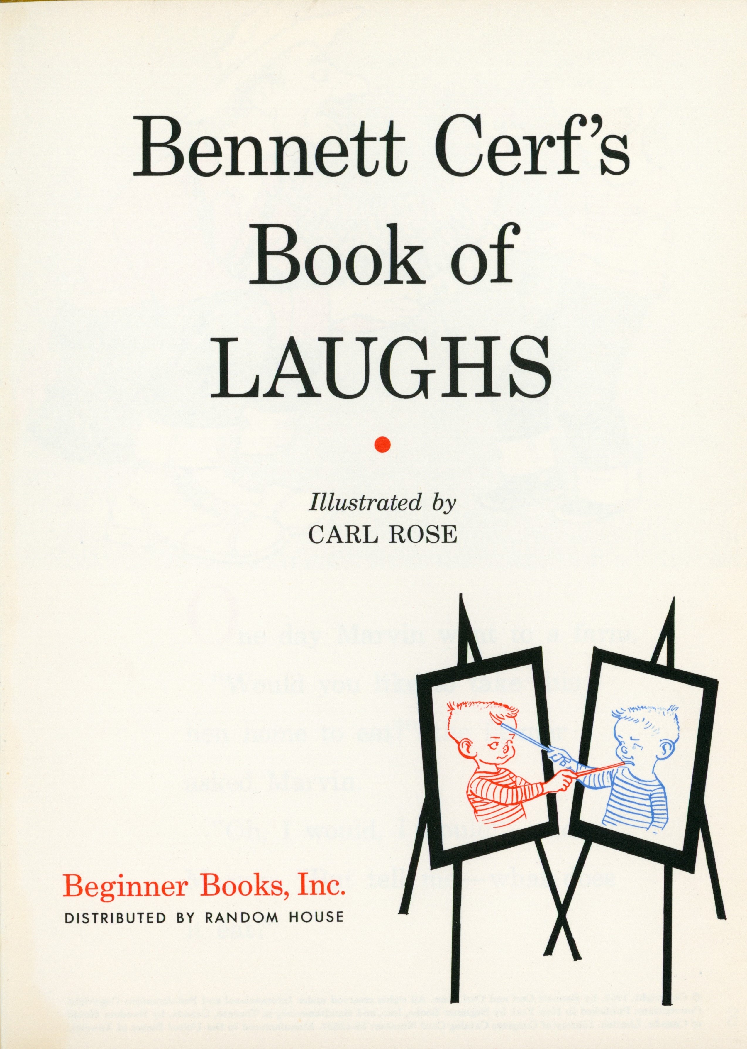 Title Page: "Bennett Cerf's / Book of / LAUGHS / Illustrated by / CARL ROSE / [color illustration] / Beginner Books, Inc. / DISTRIBUTED BY RANDOM HOUSE"