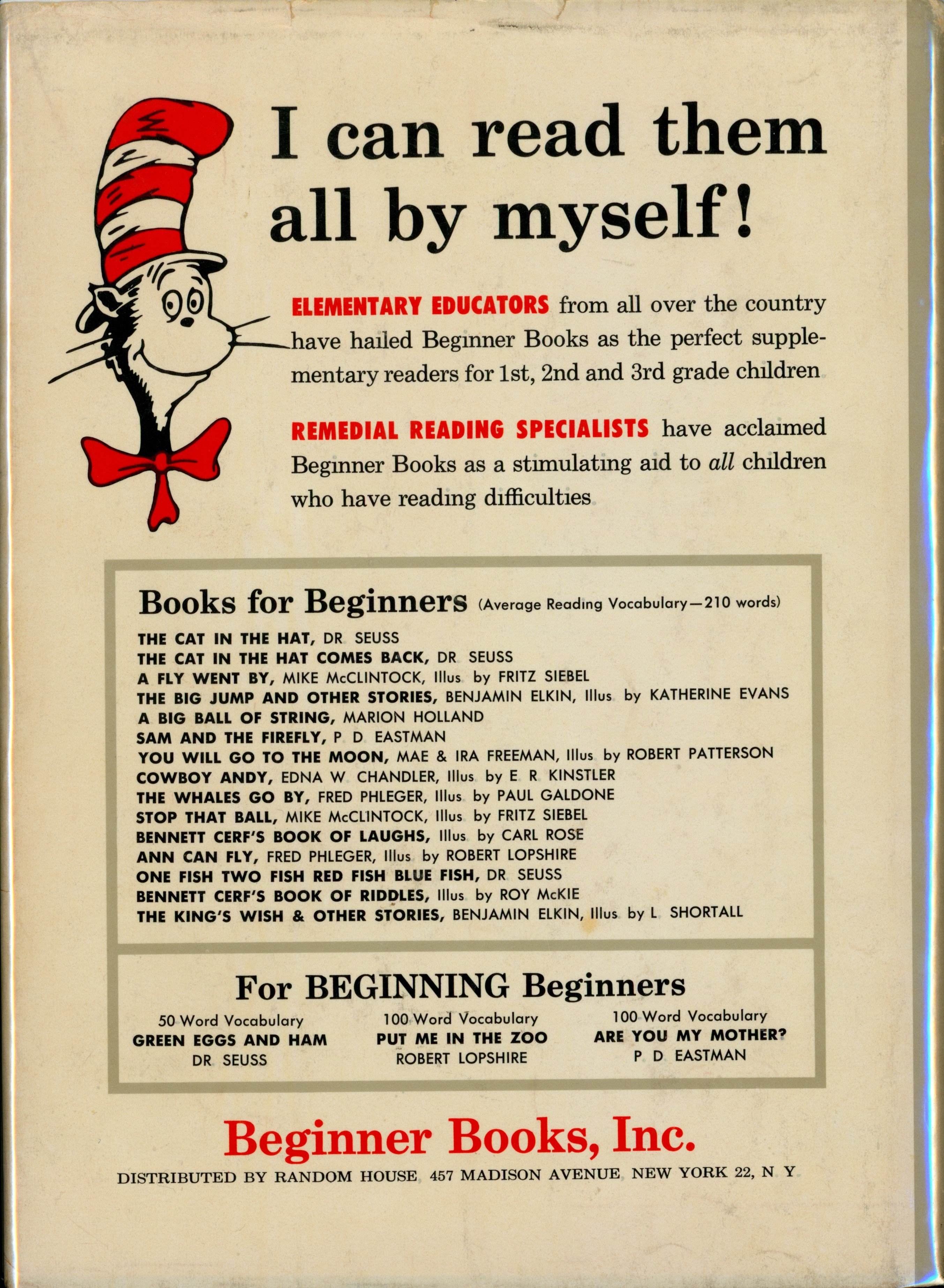"[Cat In The Hat illustration top left] / I can read them / all by myself! / ELEMENTARY EDUCATORS from all over the country ... [... paragraph] / REMEDIAL READING SPECIALISTS have acclaimed... [... paragraph] / Books for Beginners (Average Reading Vocabulary - 210 words) / [list of 15 BB titles starting with 'THE CAT IN THE HAT' to 'THE KING'S WISH & OTHER STORIES'] / for BEGINNING Beginners / 50 word vocabulary 100 word vocabulary 100 word vocabulary / GREEN EGGS AND HAM PUT ME IN THE ZOO ARE YOU MY MOTHER? / DR. SEUSS ROBERT LOPSHIRE P. D. EASTMAN / Beginner Books, Inc. / DISTRIBUTED BY RANDOM HOUSE, 457 MADISON AVE. NEW YORK 22, N.Y."
