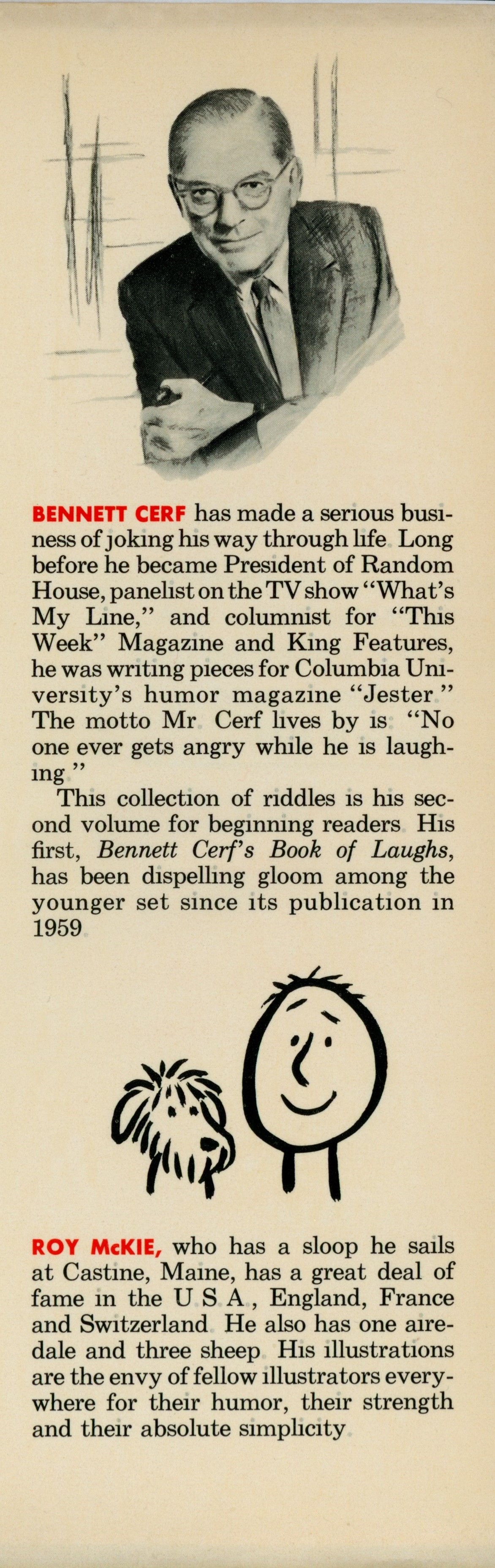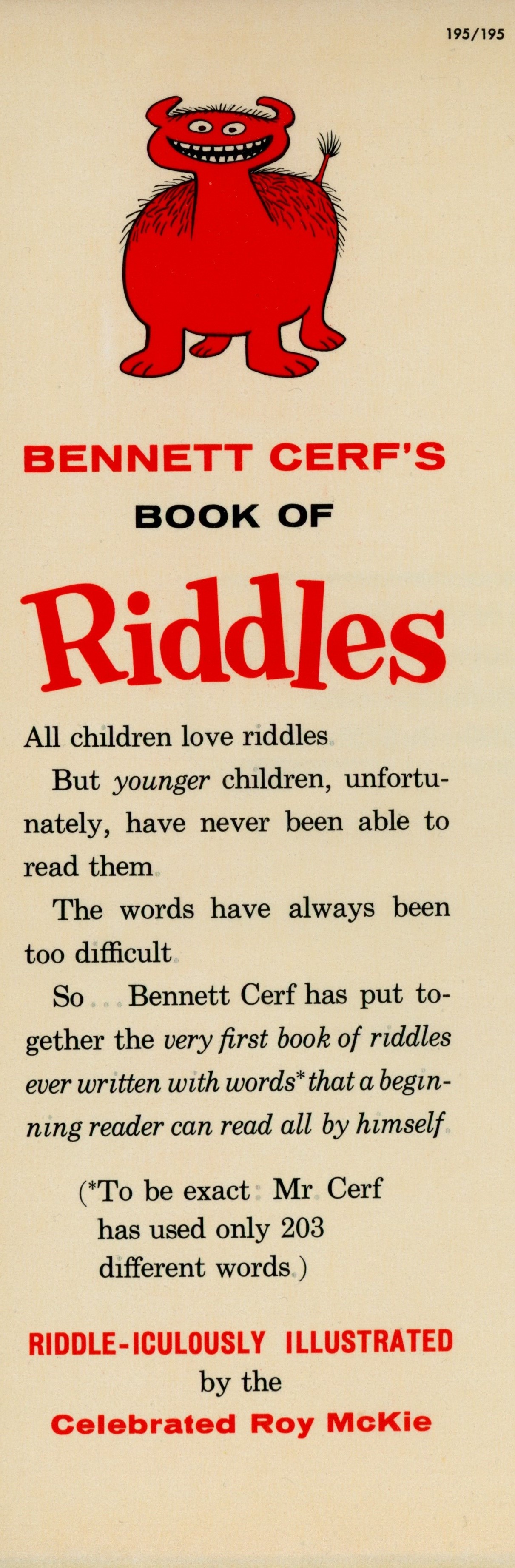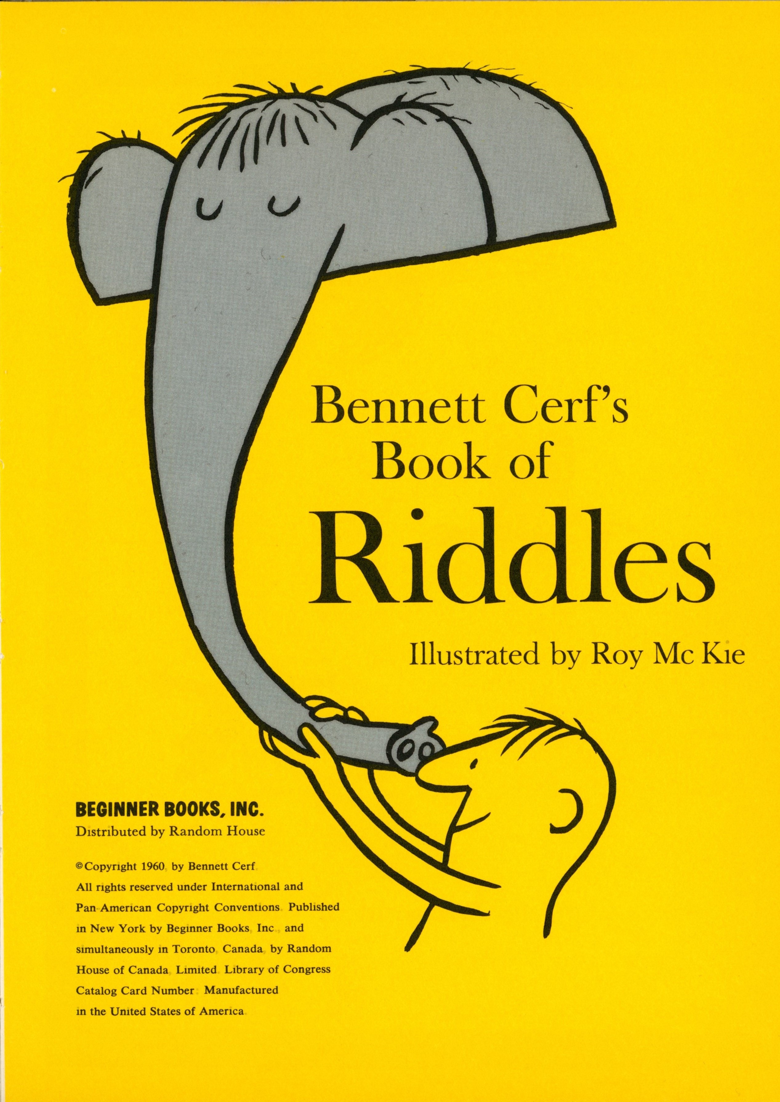 Bennett Cerf. Roy McKie (Illustrator). Bennett Cerf's Book of Riddles. New York. Beginner Books: 1960.