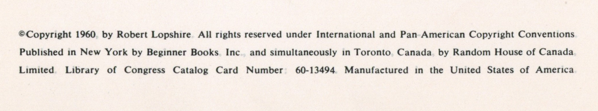 Copyright: "(c) Copyright 1960 by Robert Lopshire. All rights reserved under International and Pan-American Copyright Conventions. / Published in New York by Beginner Books, Inc., and simultaneously in Toronto, Canada, by Random House of Canada, / Limited. Library of Congress Catalog Card Number: 60-13494. Manufactured in the United States of America."