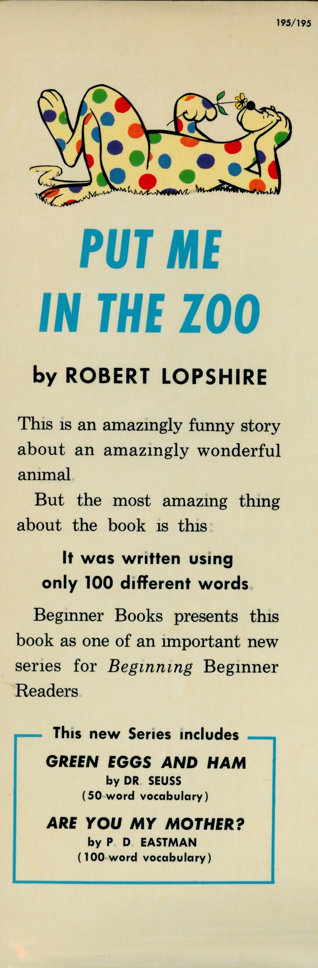 DJ Flap Front: "195/195 [top right] / [Illustration] / PUT ME / IN THE ZOO / by ROBERT LOPSHIRE / This is an amazingly funny story ... [... paragraph] / But the most amazing thing / about the book is this / It was written using / only 100 different words / Beginner Books presents this ... [... paragraph] / This new series includes / GREEN EGGS AND HAME / by DR. SEUSS / (50-word vocabulary) / ARE YOU MY MOTHER? / by P. D. EASTMAN (100-word vocabulary"