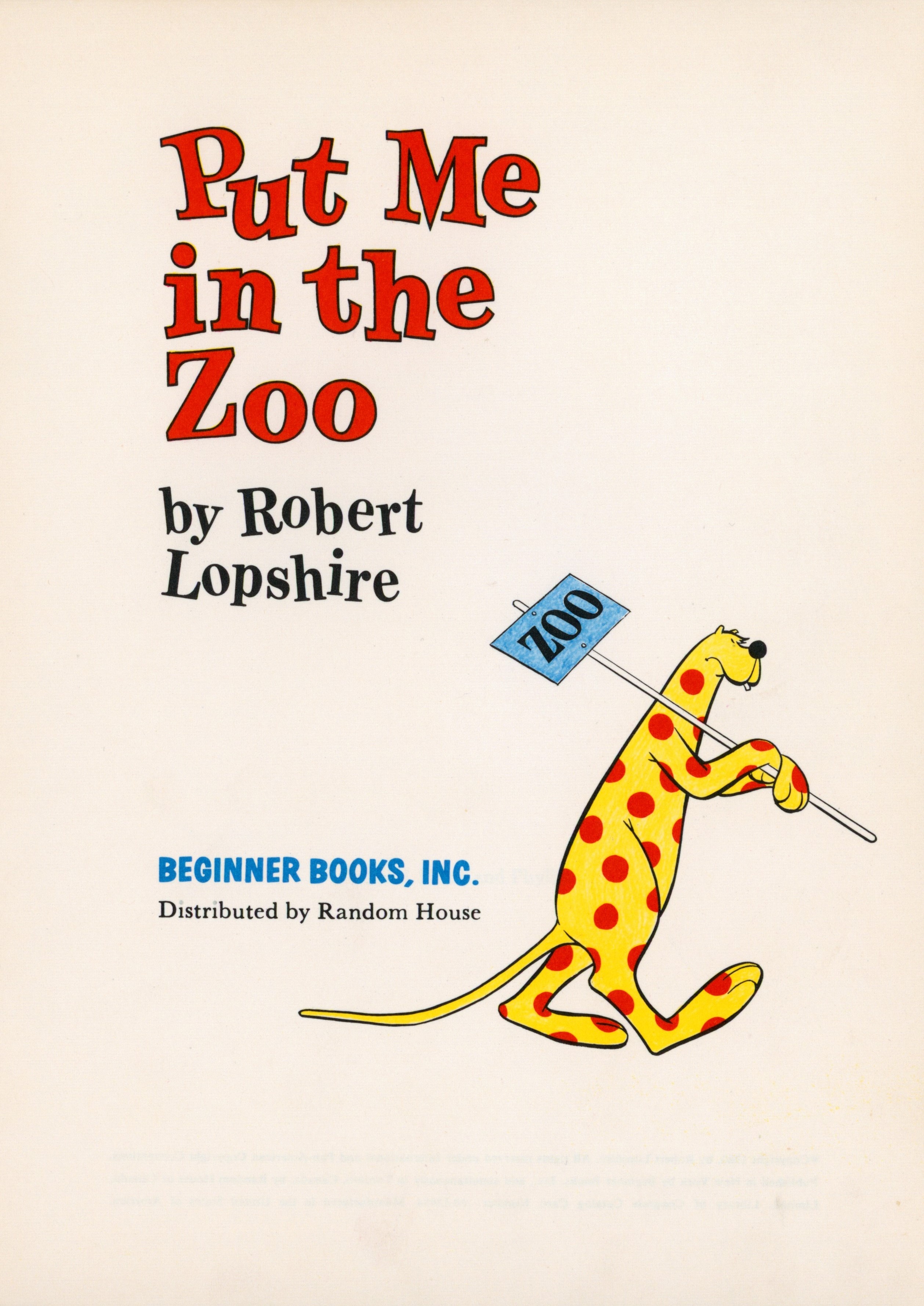 Title Page: "Put Me / in the / Zoo / By Robert / Lopshire / [illustration] / BEGINNER BOOKS, INC. / DISTRIBUTED BY RANDOM HOUSE"