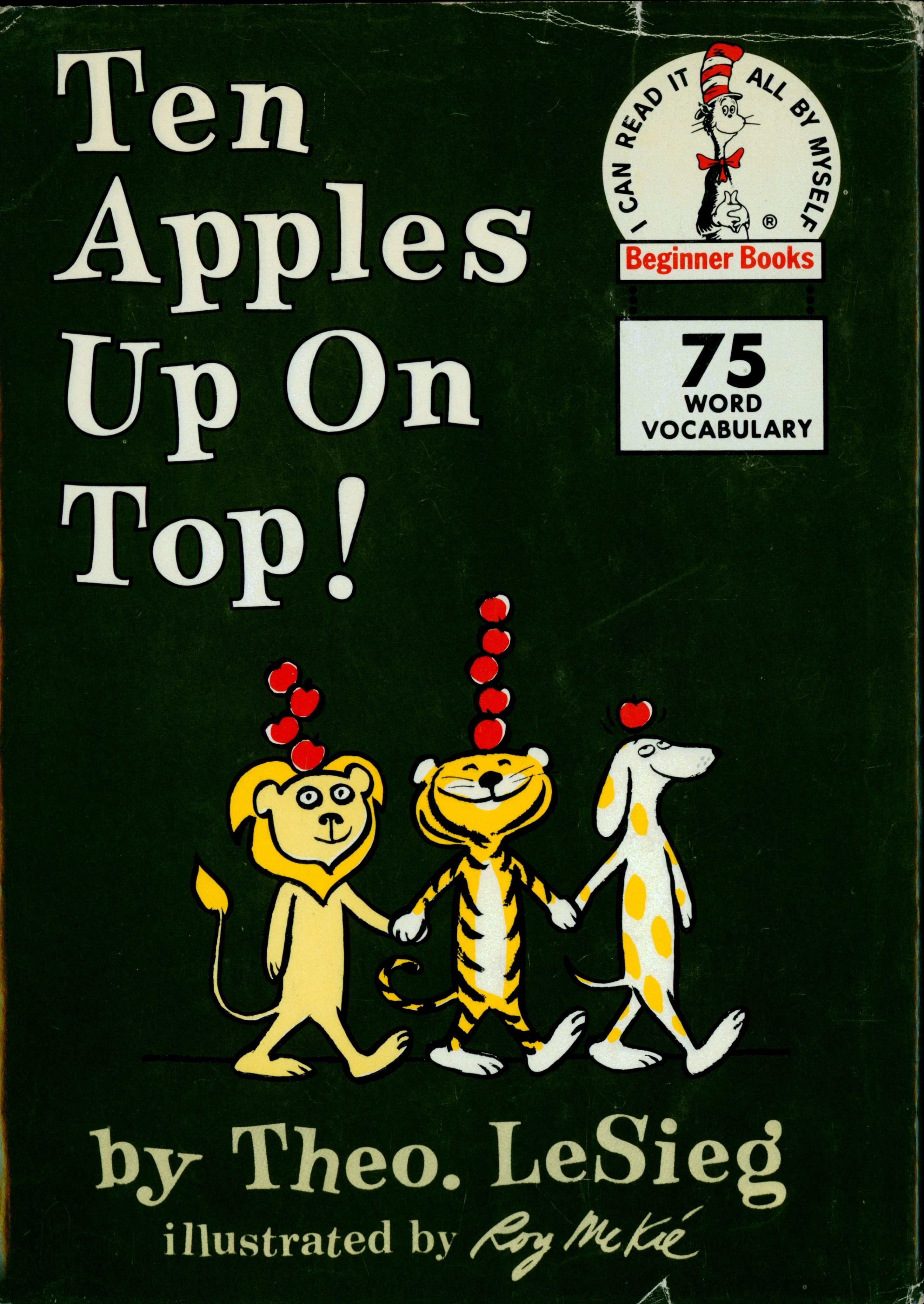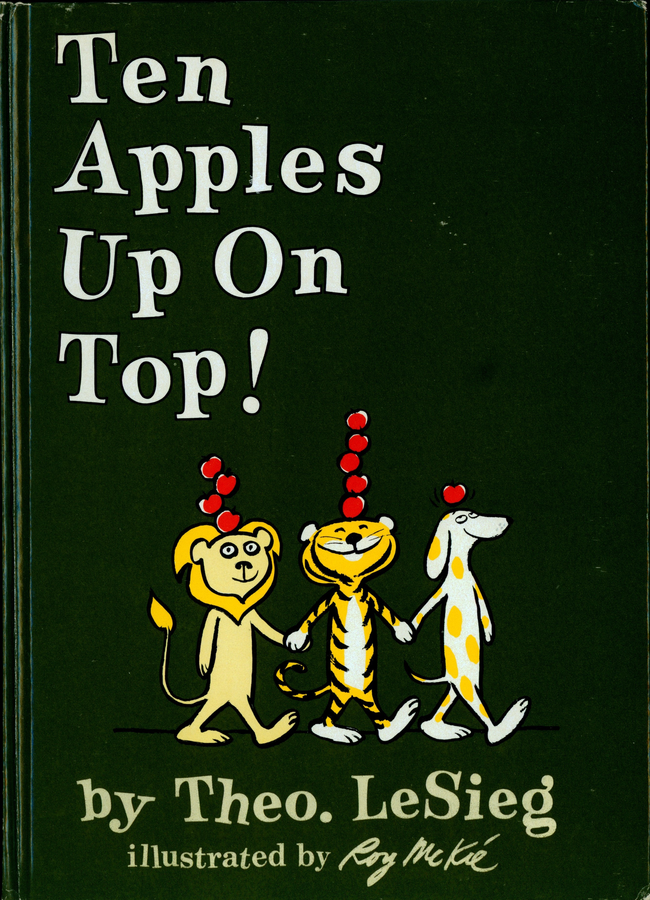 Book Front: Bound in glossy dark green paper covered boards with color illustration. "Ten / Apples / Up On / Top! / By Theo. LeSieg /Illustrated by Roy McKie"
