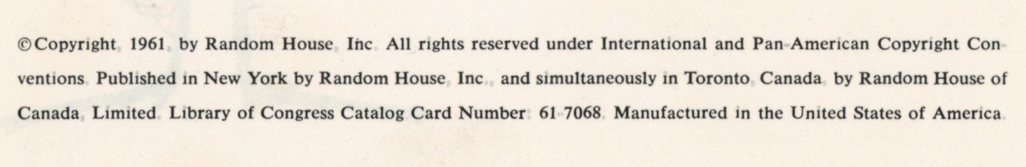 Copyright: "(c) Copyright 1961 by Random House. All rights reserved under International and Pan-American Copyright Con- / ventions. Published in New York by Beginner Books, Inc., and simultaneously in Toronto, Canada, by Random House of / Canada, Limited. Library of Congress Catalog Card Number: 61-7068. Manufactured in the United States of America."