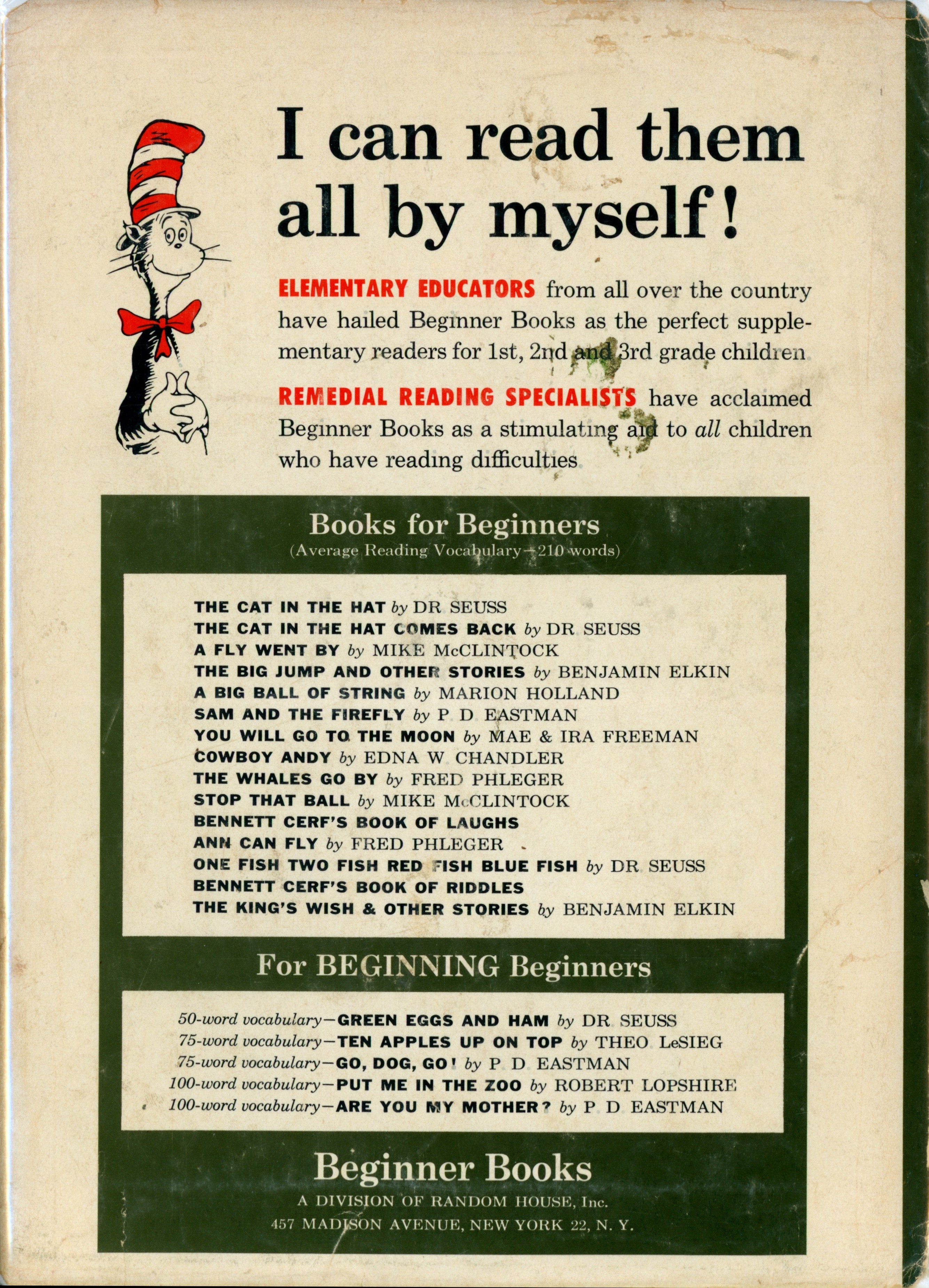 "[Cat In The Hat illustration top left] / I can read them / all by myself! / ELEMENTARY EDUCATORS from all over the country ... [... paragraph] / REMEDIAL READING SPECIALISTS have acclaimed... [... paragraph] / Books for Beginners (Average Reading Vocabulary - 210 words) / [list of 15 BB titles starting with 'THE CAT IN THE HAT' to 'THE KING'S WISH & OTHER STORIES'] / for BEGINNING Beginners / [list of 5 BB titles starting with 'GREEN EGGS AND HAM' to ' ARE YOU MY MOTHER?' / Beginner Books, Inc. / A DIVISION OF RANDOM HOUSE / 457 MADISON AVE. NEW YORK 22, N.Y."