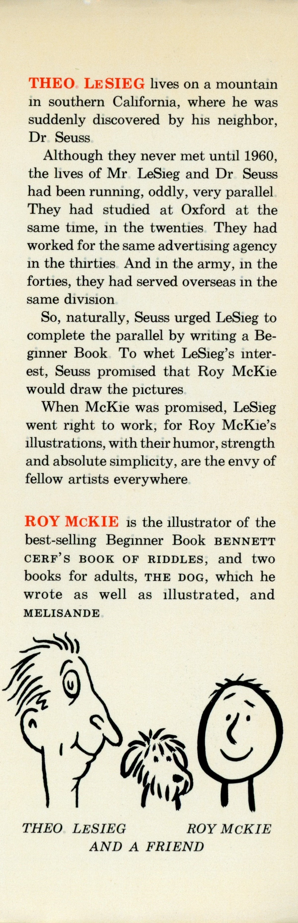 DJ Flap Back: "[Three paragraph Theo LeSieg biography] / [One paragraph Roy McKie biography] / [Caricature of Theo LeSieg, a dog, and Roy McKie] / THEO. LeSieg ROY McKie / AND A FRIEND"