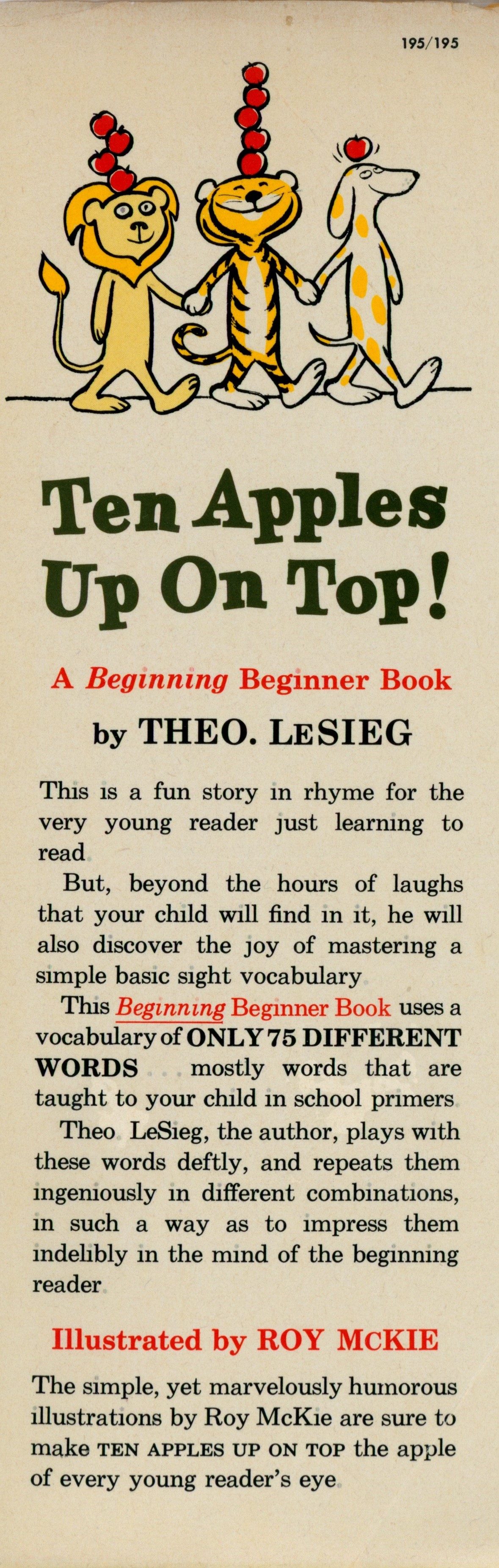 DJ Flap Front: "195/195 [top right] / [illustration] / Ten Apples / Up On Top! / A Beginning Beginner Book / by THEO. LeSieg / This is a fun story in rhyme for the ... [... paragraph] / But, beyond the hours of laughs ... [...paragraph] / This Beginning Beginner Book uses a ... [... paragraph] / Theo. LeSieg, the author, plays with ... [... paragraph] / Illustrated by ROY McKie / The simple, yet marvelously humorous ... [... paragraph]"