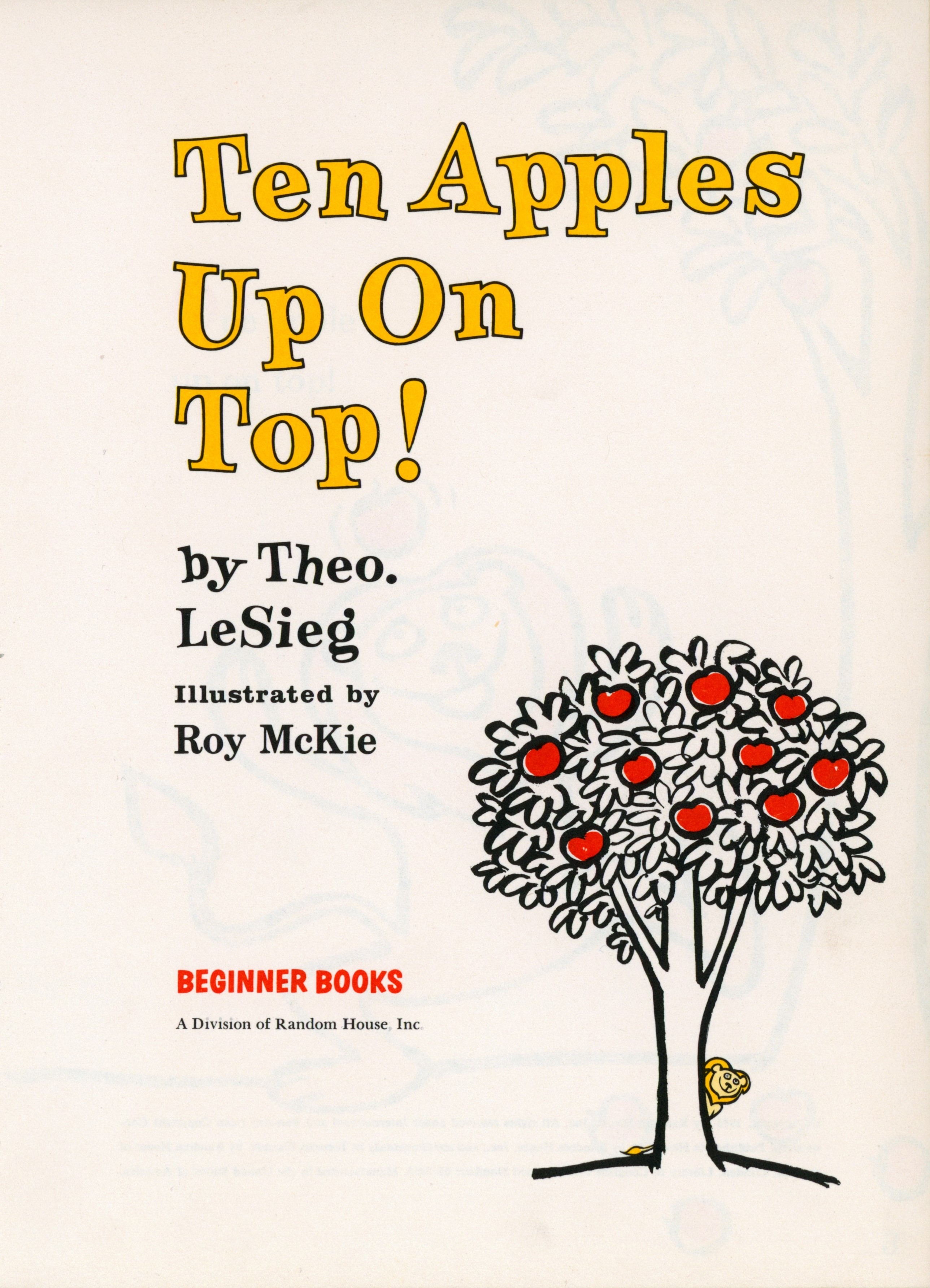Title Page: "Ten Apples / Up On / Top! / By Theo. / LeSieg / Illustrated by / Roy McKie / [illustration] / BEGINNER BOOKS / A Division of Random House"