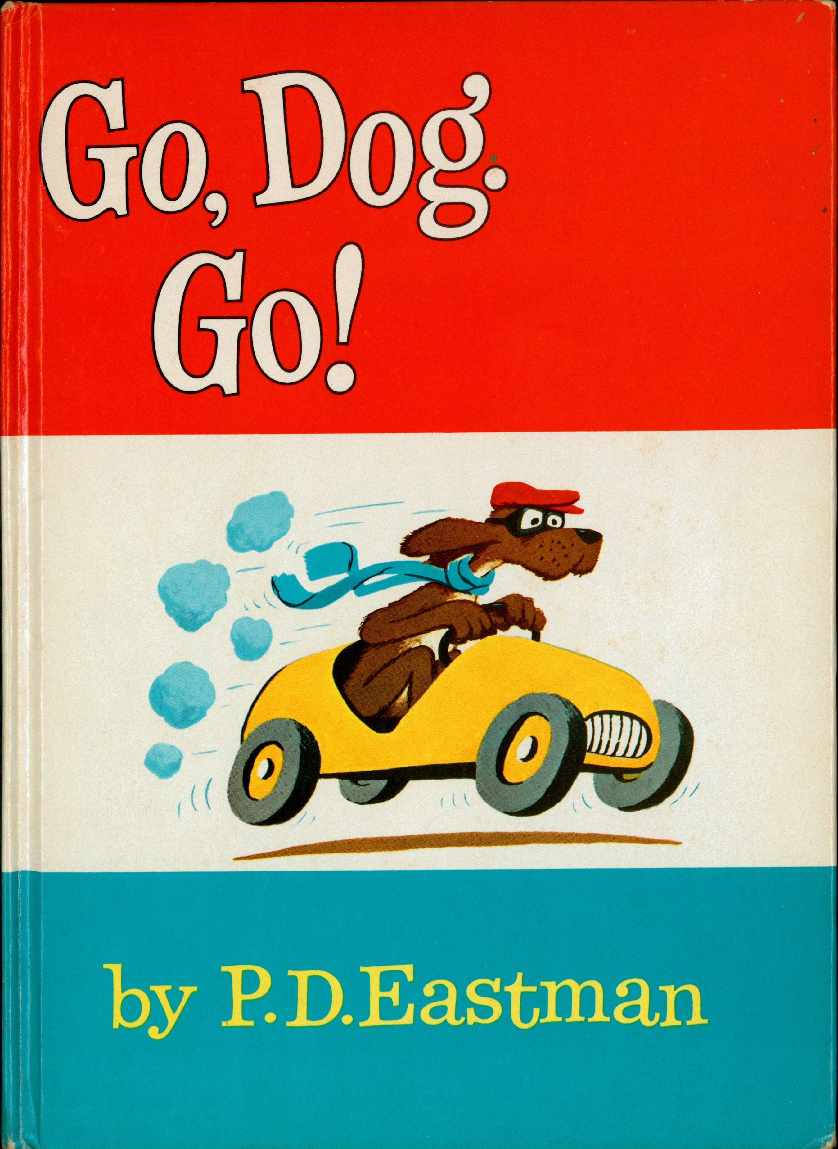 Book Front: Bound in glossy red-white-blue banded paper covered boards with color illustration. "Go, Dog. / Go! / By P.D. Eastman"