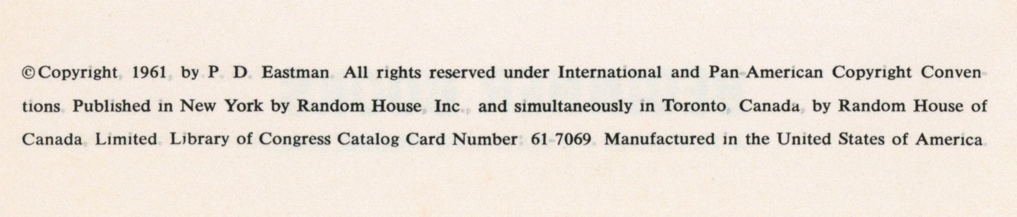 Copyright: "(c) Copyright 1961 by P. D. Eastman. All rights reserved under International and Pan-American Copyright Conven- / tions. Published in New York by Beginner Books, Inc., and simultaneously in Toronto, Canada, by Random House of / Canada, Limited. Library of Congress Catalog Card Number: 61-7069. Manufactured in the United States of America."