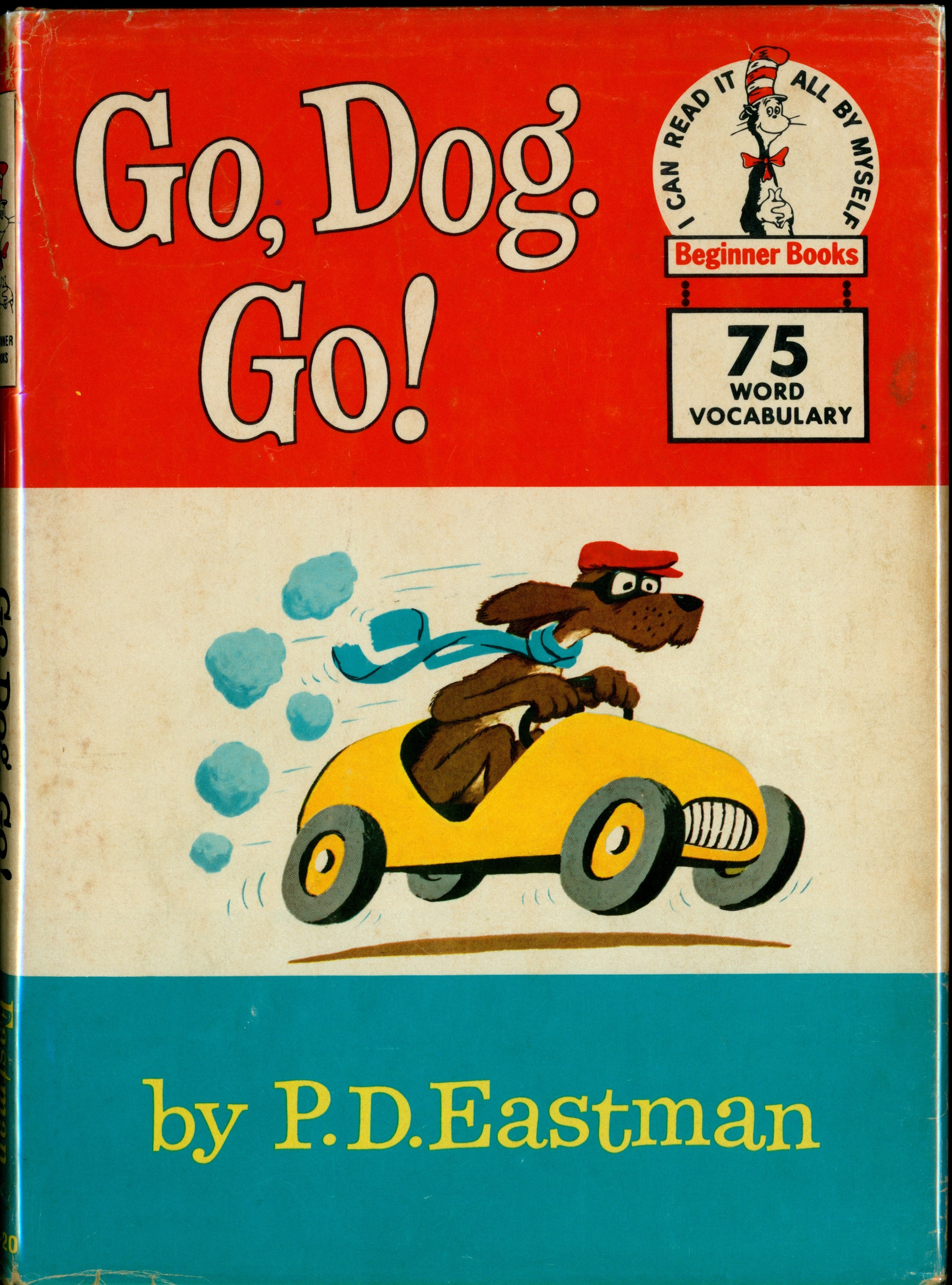 DJ Spine: "[BB logo] BEGINNER BOOKS [black horizontal text] Go, Dog. Go! Eastman B-20 [yellow horizontal text]"