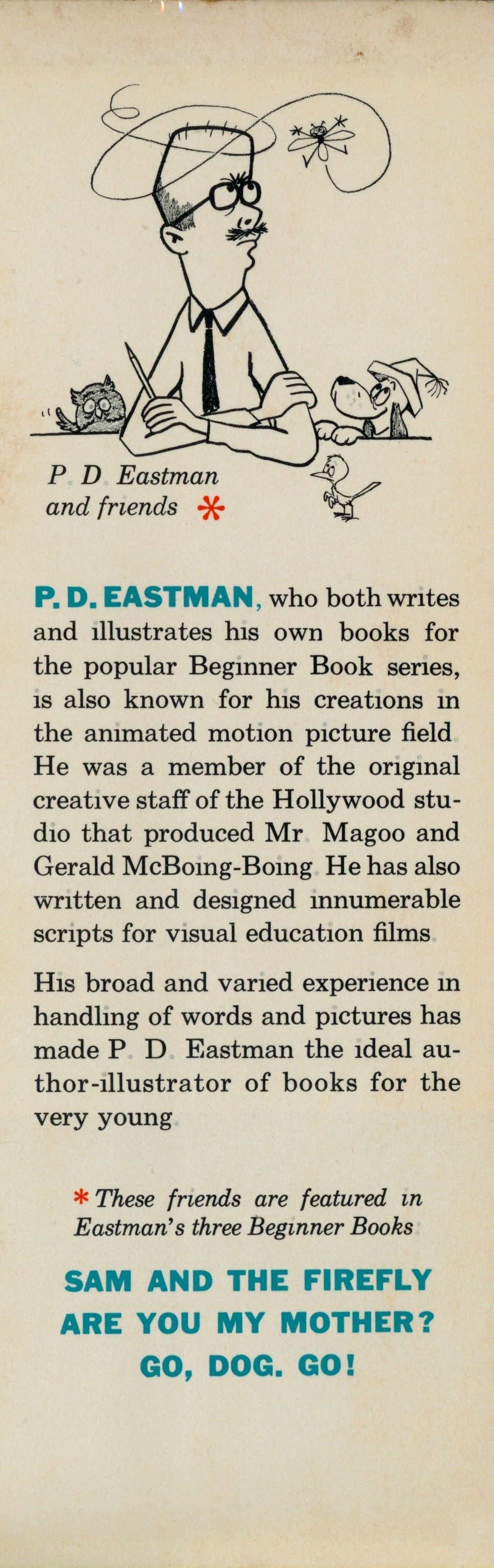 DJ Flap Back: "[Caricature of P.D. Eastman] / P. D. Eastman / and friends* / P.D. Eastman, who both writes ... [...paragraph] / "His broad and varied experience in ... [...paragraph] / *These friends are featured in / Eastman's three Beginner Books / SAM AND THE FIREFLY / ARE YOU MY MOTHER? / GO, DOG. GO!"