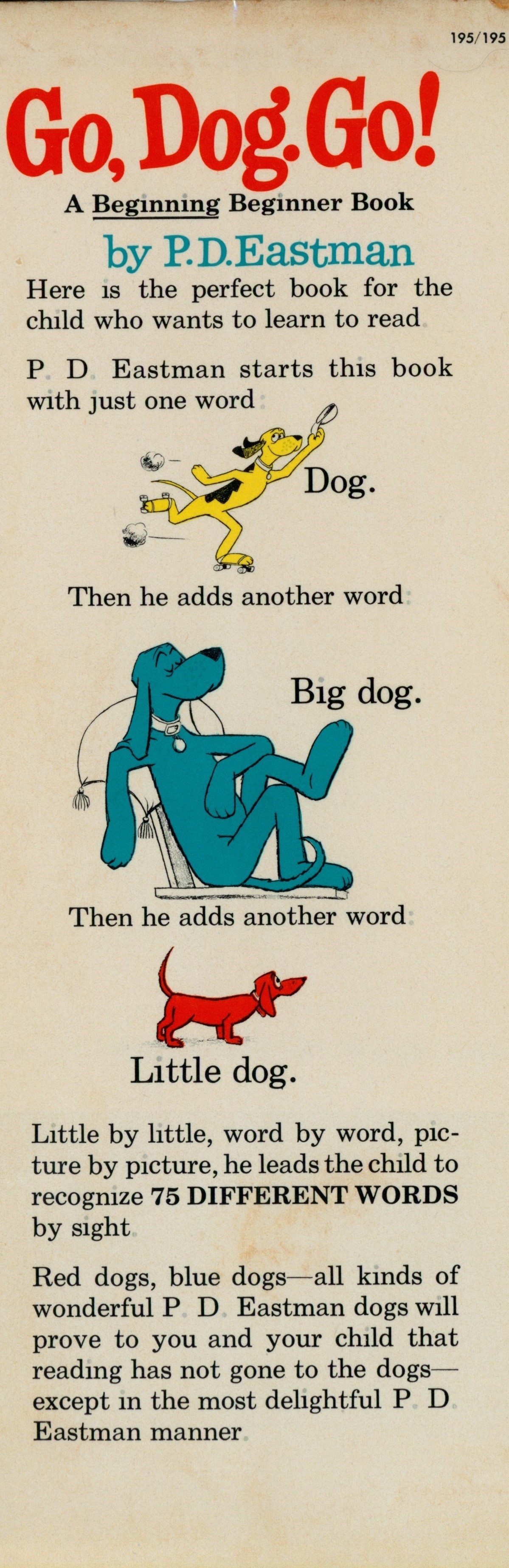 DJ Flap Front: "195/195 [top right] / Go, Dog. Go! / A Beginning Beginner book / P.D. Eastman / Here is the perfect book for the / child who wants to learn to read / P. D. Eastman starts this book / with just one word / Dog. / The he adds another word: / Big dog. / The he adds another word: / Little dog. / Little by little, word by word, pic- ... [... paragraph] / Red dogs, blue dogs--all kinds of ... [... paragraph]"