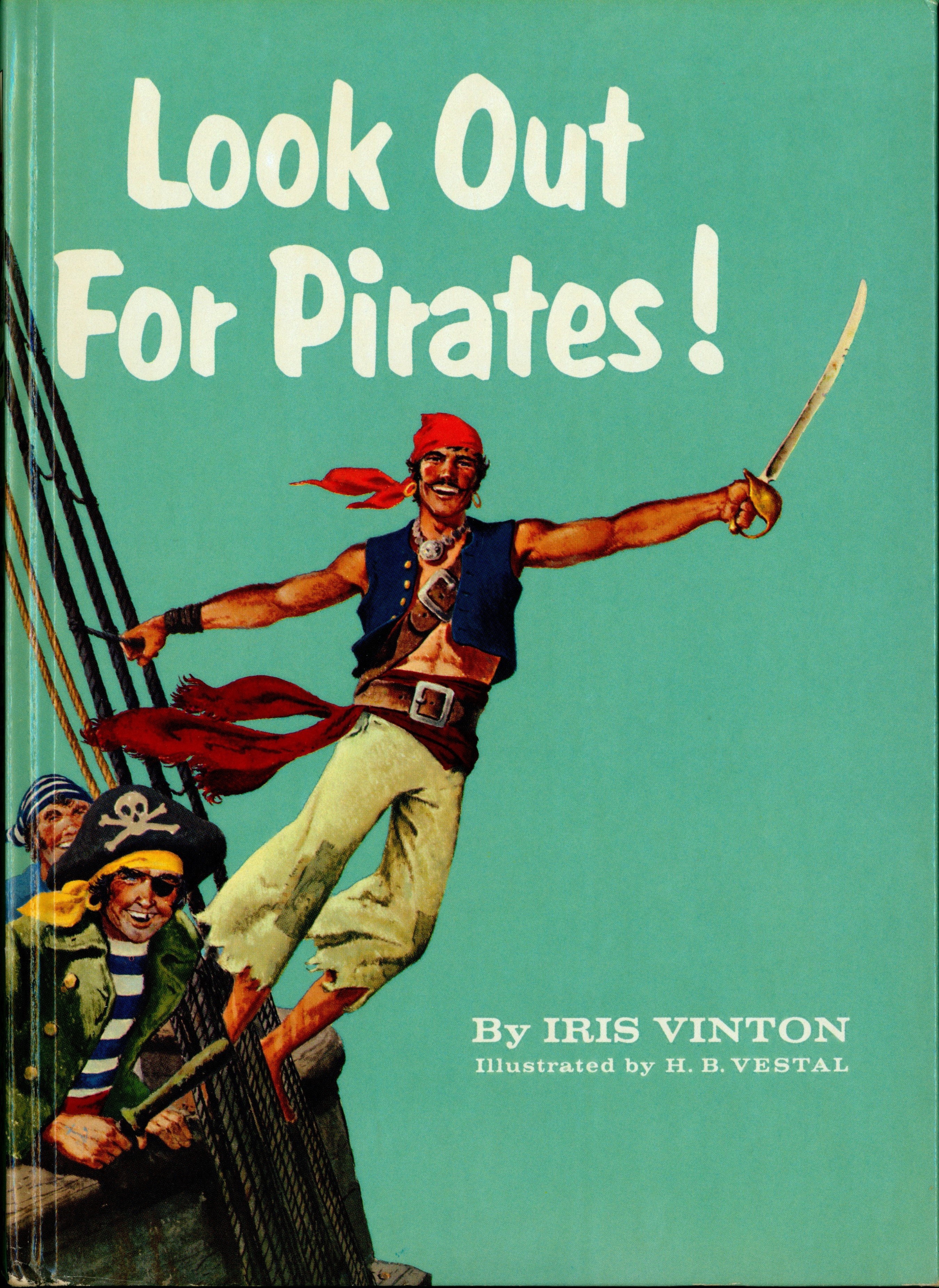 Book Front: Bound in glossy teal paper covered boards with color illustration. "Look Out / For Pirates! / By IRIS VINTIN / Illustrated by H. B. VESTAL"