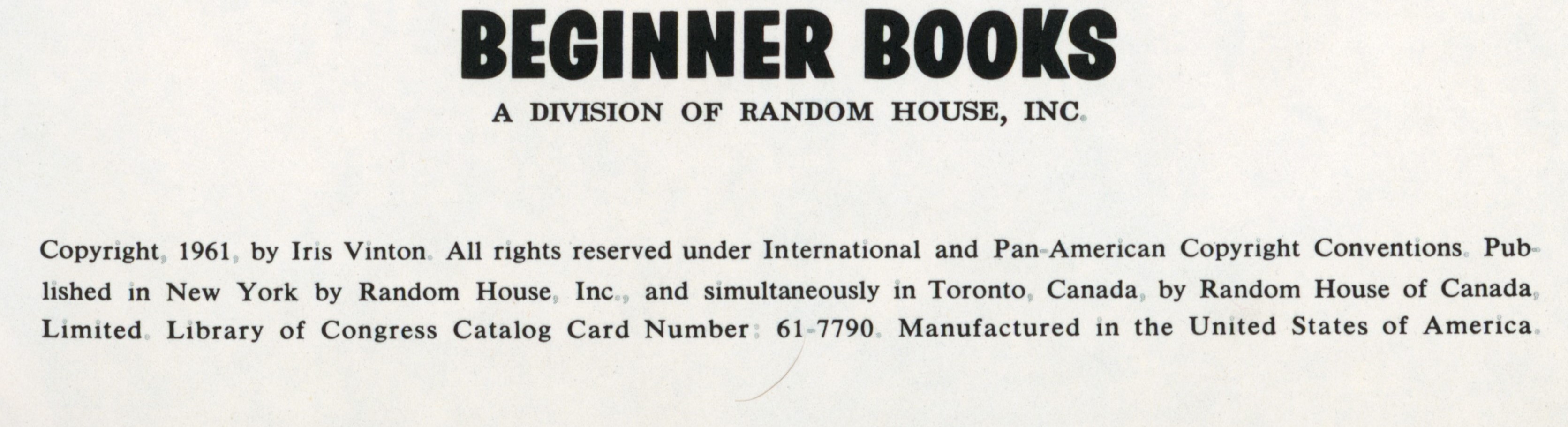 Copyright: "(c) Copyright 1961 by Iris Vinton. All rights reserved under International and Pan-American Copyright Conventions. Pub- / lished in New York by Beginner Books, Inc., and simultaneously in Toronto, Canada, by Random House of Canada, / Limited. Library of Congress Catalog Card Number: 61-7790. Manufactured in the United States of America."