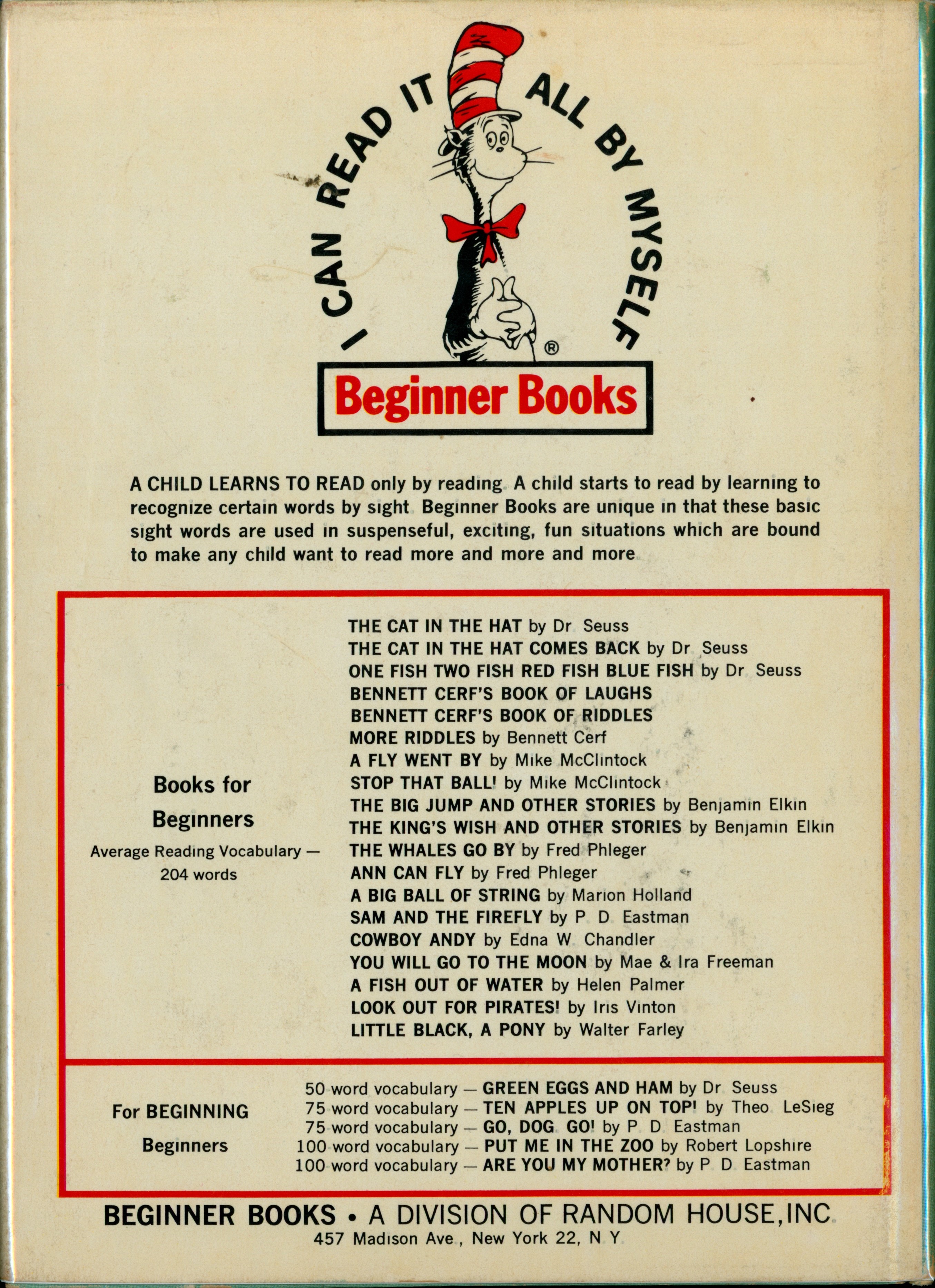 "[Large Beginner Books logo] / A CHILD LEARNS TO READ... [... paragraph] / Books for / Beginners / Average Reading Vocabulary -- / 204 words / [list of 19 BB titles starting with 'THE CAT IN THE HAT' to 'LITTLE BLACK A PONY'] / for BEGINNING Beginners / [list of 5 BB titles starting with 'GREEN EGGS AND HAM' to 'ARE YOU MY MOTHER?' / BEGINNER BOOKS • A DIVISION OF RANDOM HOUSE, INC. / 457 Madison Ave, New York 22, N.Y."