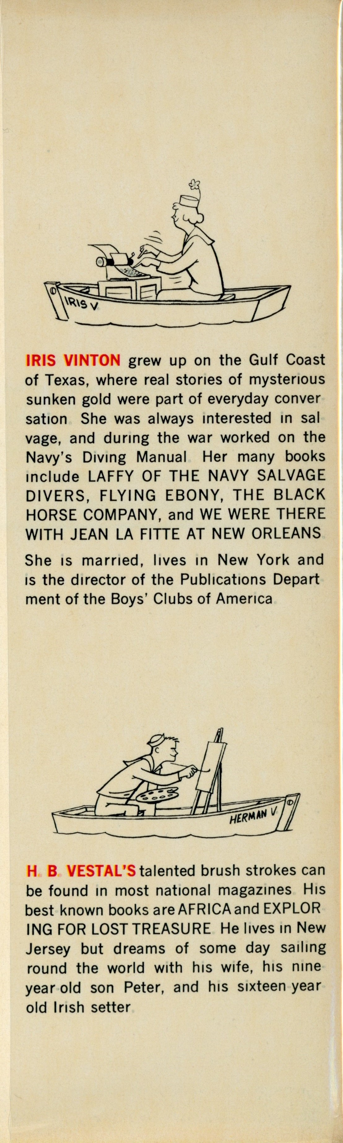 DJ Flap Back: "[Cartoon of Iris Vinton typing in a boat] / [Two paragraph Iris Vinton biography] / [Cartoon of H.B Vestal painting in a boat] / [One paragraph H.B. Vestal biography]"