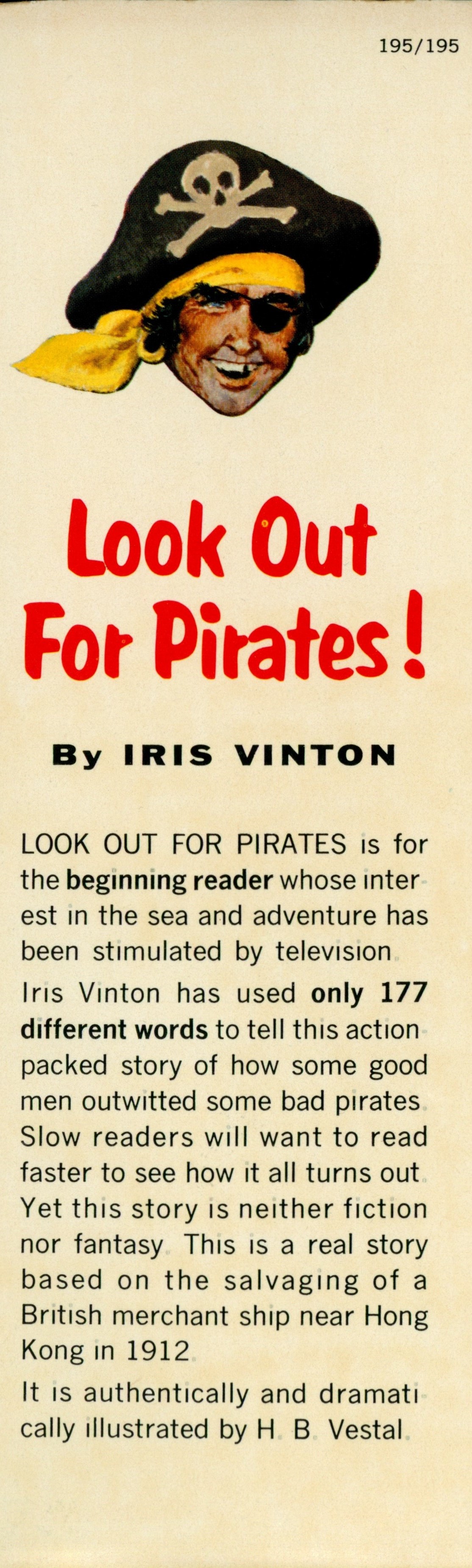 DJ Flap Front: "195/195[top right] / [Illustration] / Look Out / For Pirates! / By IRIS VINTON / LOOK OUR FOR PIRATES is for ... [... paragraph] / Iris Vinton has used only 177 ... [...paragraph] / It is this authentically and dramati- / cally illustrated by H. B. Vestal"