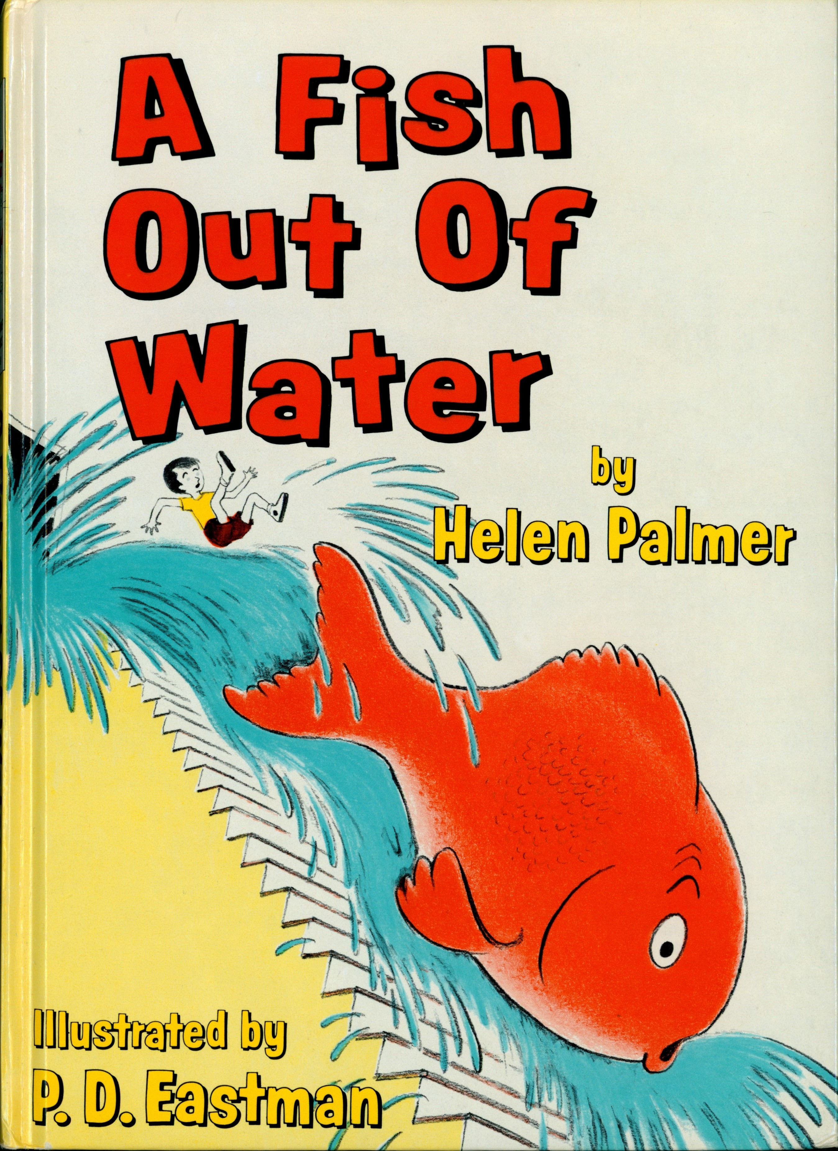 Book Front: Bound in glossy white paper covered boards with color illustration. "A Fish / Out of / Water / By Helen Palmer / Illustrated by / P.D. Eastman"