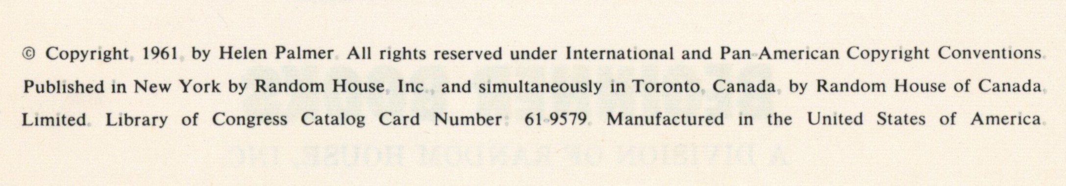 Copyright: "(c) Copyright 1961 by Helen Palmer. All rights reserved under International and Pan-American Copyright Conventions. / Published in New York by Beginner Books, Inc., and simultaneously in Toronto, Canada, by Random House of Canada, / Limited. Library of Congress Catalog Card Number: 61-9579. Manufactured in the United States of America."