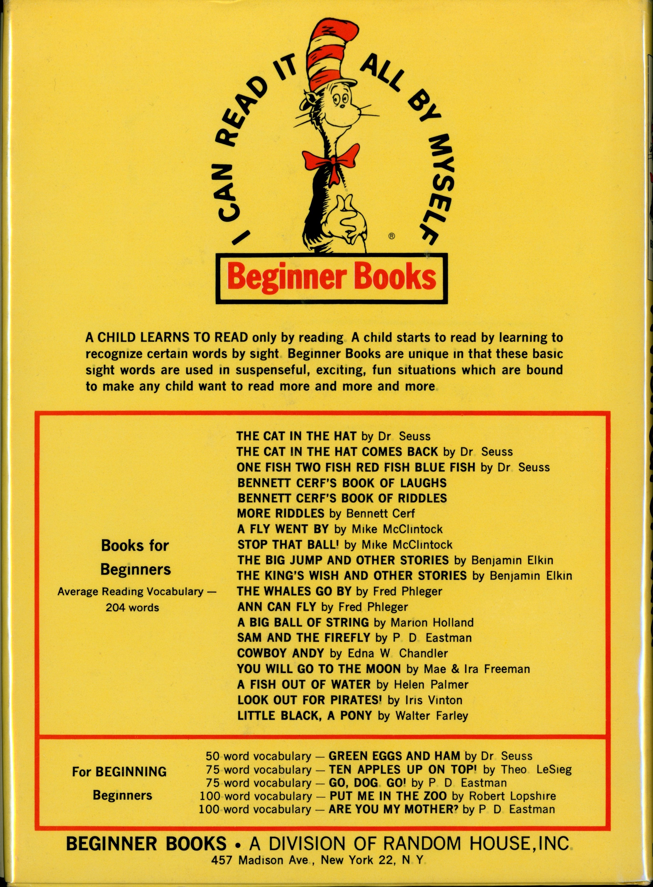 "[Large Beginner Books logo] / A CHILD LEARNS TO READ... [... paragraph] / Books for / Beginners / Average Reading Vocabulary -- / 204 words / [list of 19 BB titles starting with 'THE CAT IN THE HAT' to 'LITTLE BLACK A PONY'] / for BEGINNING Beginners / [list of 5 BB titles starting with 'GREEN EGGS AND HAM' to 'ARE YOU MY MOTHER?' / BEGINNER BOOKS • A DIVISION OF RANDOM HOUSE, INC. / 457 Madison Ave, New York 22, N.Y."