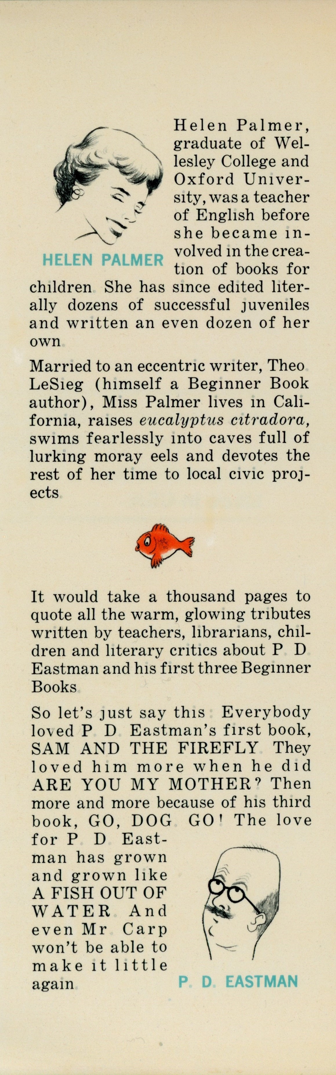 DJ Flap Back: "[Drawing of Helen Palmer} / [Two paragraph Helen Palmer biography] / [fish illustration] / [Two paragraph P.D. Eastman biography] / [Caricature of P.D. Eastman]"