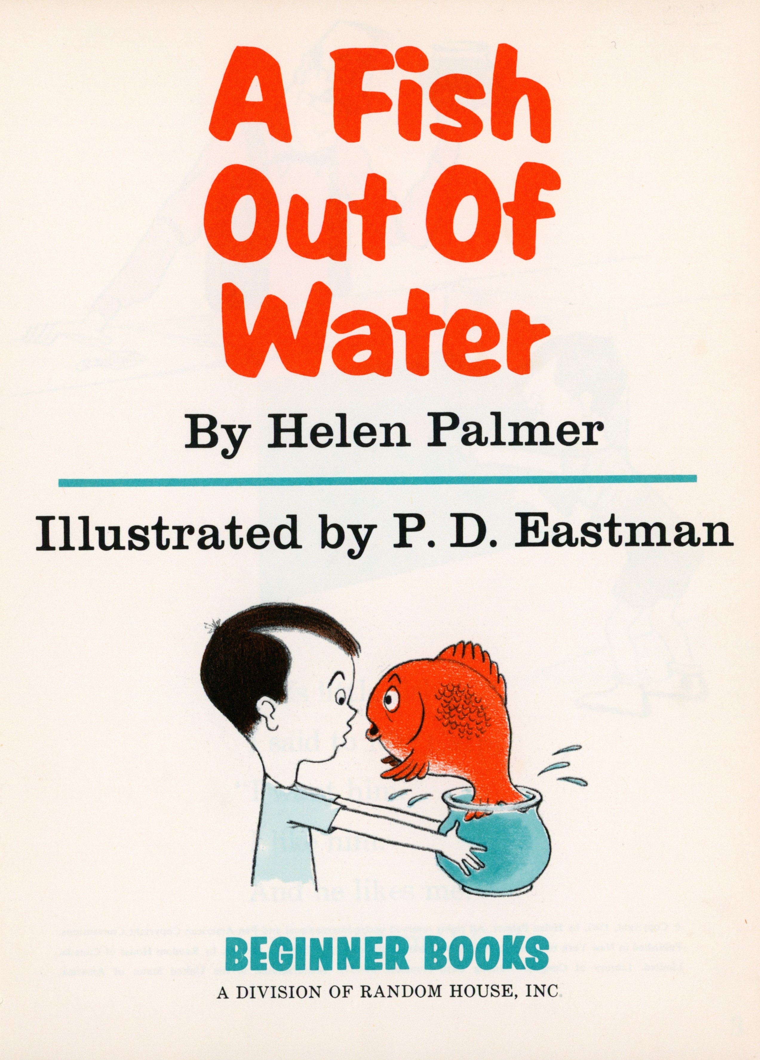 Title Page: "A Fish / Out of / Water / By Helen Palmer / Illustrated by P.D. Eastman / [illustration] / BEGINNER BOOKS / A DIVISION OF RANDOM HOUSE, INC."