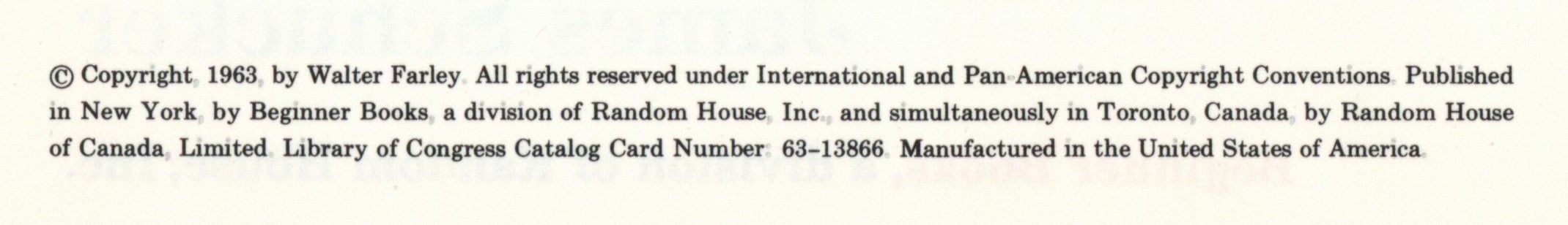 Copyright: "(c) Copyright 1963 by Dr. Walter Farley. All rights reserved under International and Pan-American Copyright Conventions. Published / in New York by Random House, Inc., and simultaneously in Toronto, Canada, by Random House / of Canada, Limited. Library of Congress Catalog Card Number: 63-13866. Manufactured in / the United States of America."