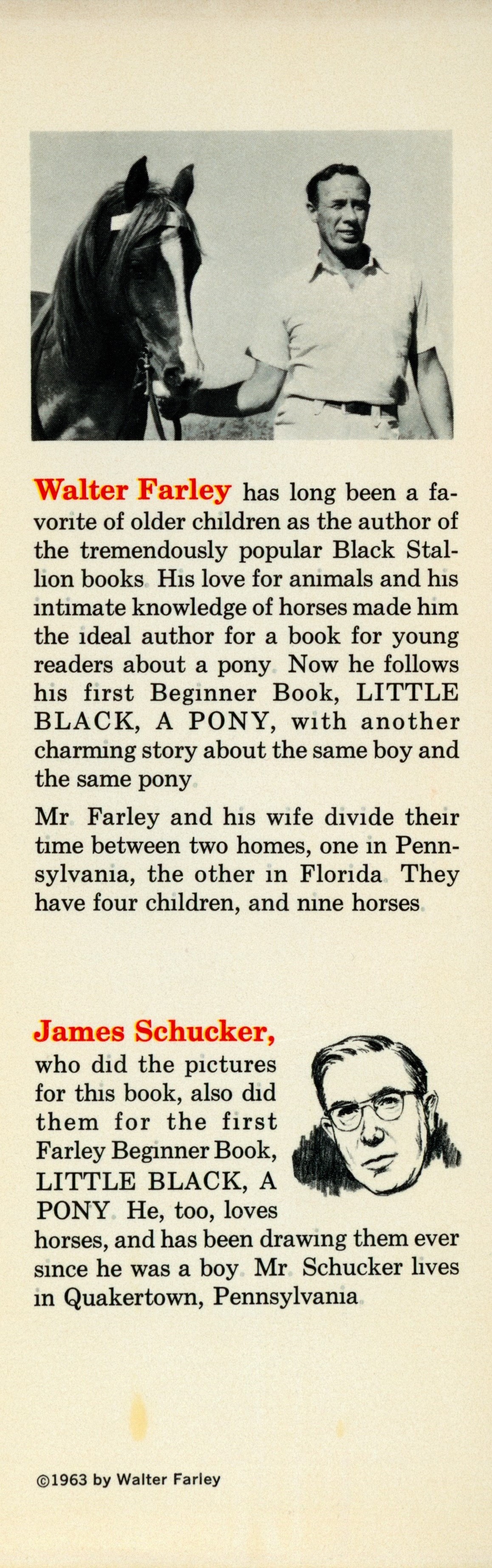 DJ Flap Back: "[Photo of Walter Farley} / [Two paragraph Walter Farley biography] / [One paragraph James Schucker biography] / [drawing of James Schucker] / (c) 1963 by Walter Farley"