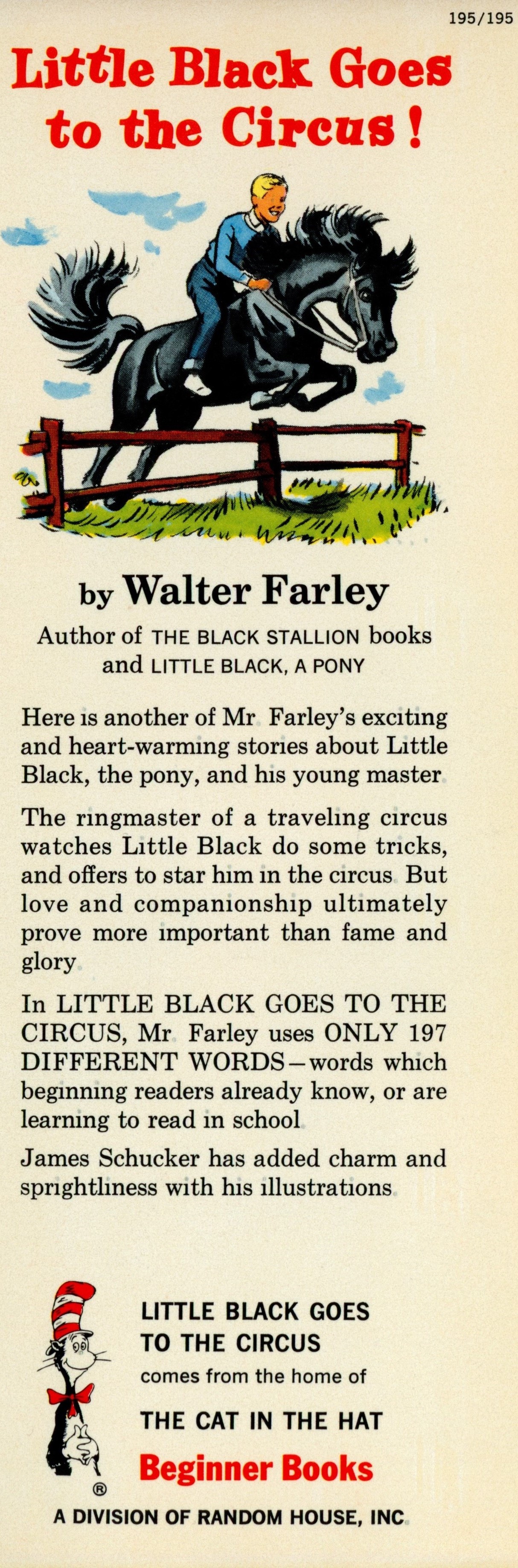 DJ Flap Front: "195/195 [top right] / Little Black Goes / To The Circus! / By Walter Farley / Author of THE BLACK STALLION books / and LITTLE BLACK, A PONY / Here is another of Mr. Farley's exciting ... [... paragraph] / The ringmaster of a traveling circus ... [...paragraph] / In LITTLE BLACK GOES TO THE ... [... paragraph] / James Schucker has added charm and / sprightliness with his illustrations. / LITTLE BLACK GOES / TO THE CIRCUS / comes from the home of / THE CAT IN THE HAT / Beginner Books / A DIVISION OF RANDOM HOUSE, INC."